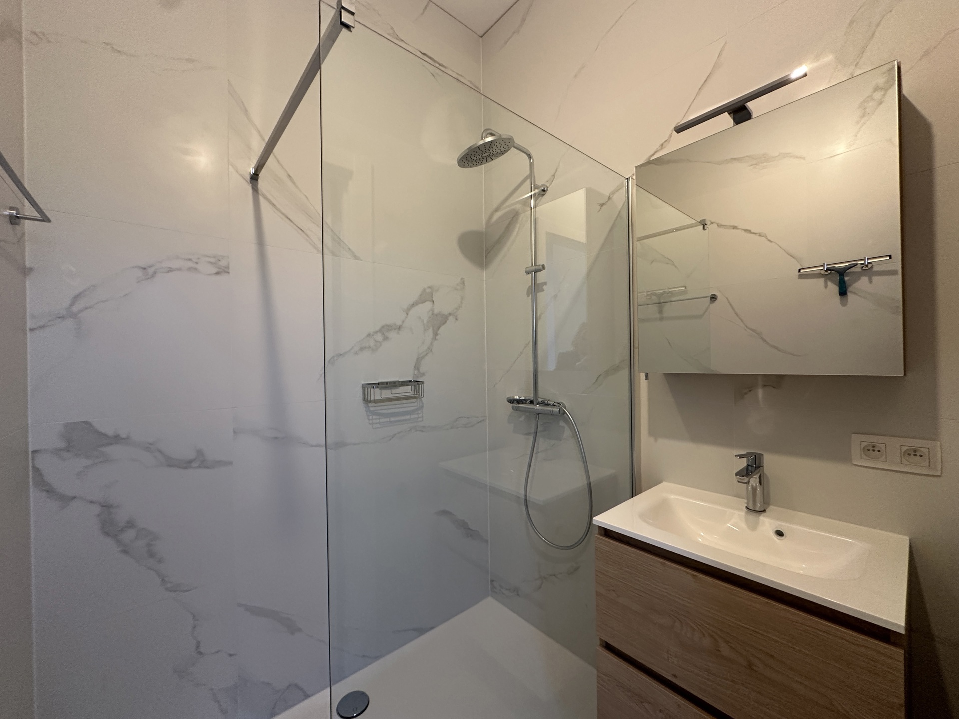 The apartment has a bedroom with an adjoining bathroom, equipped with a modern walk-in shower.