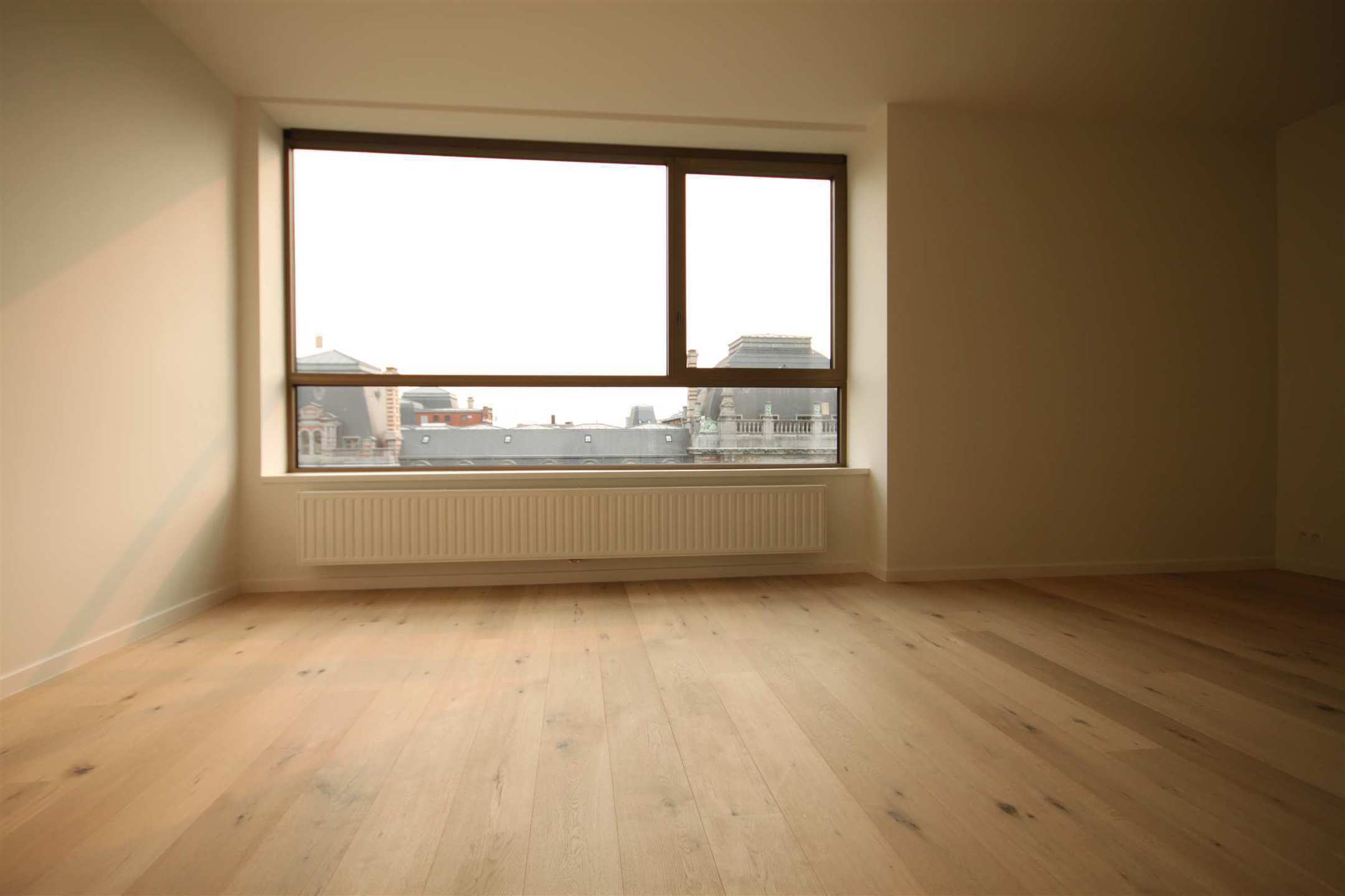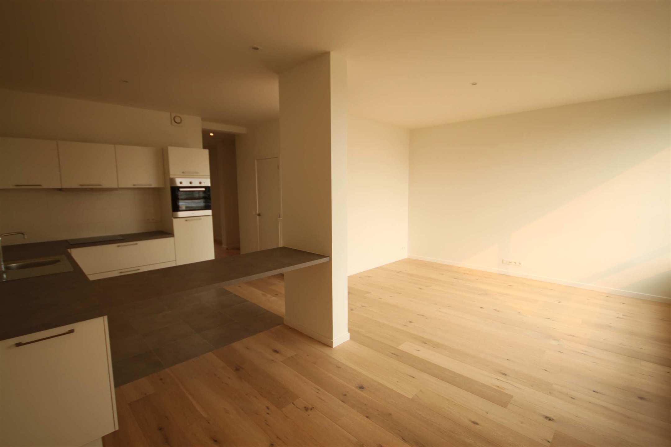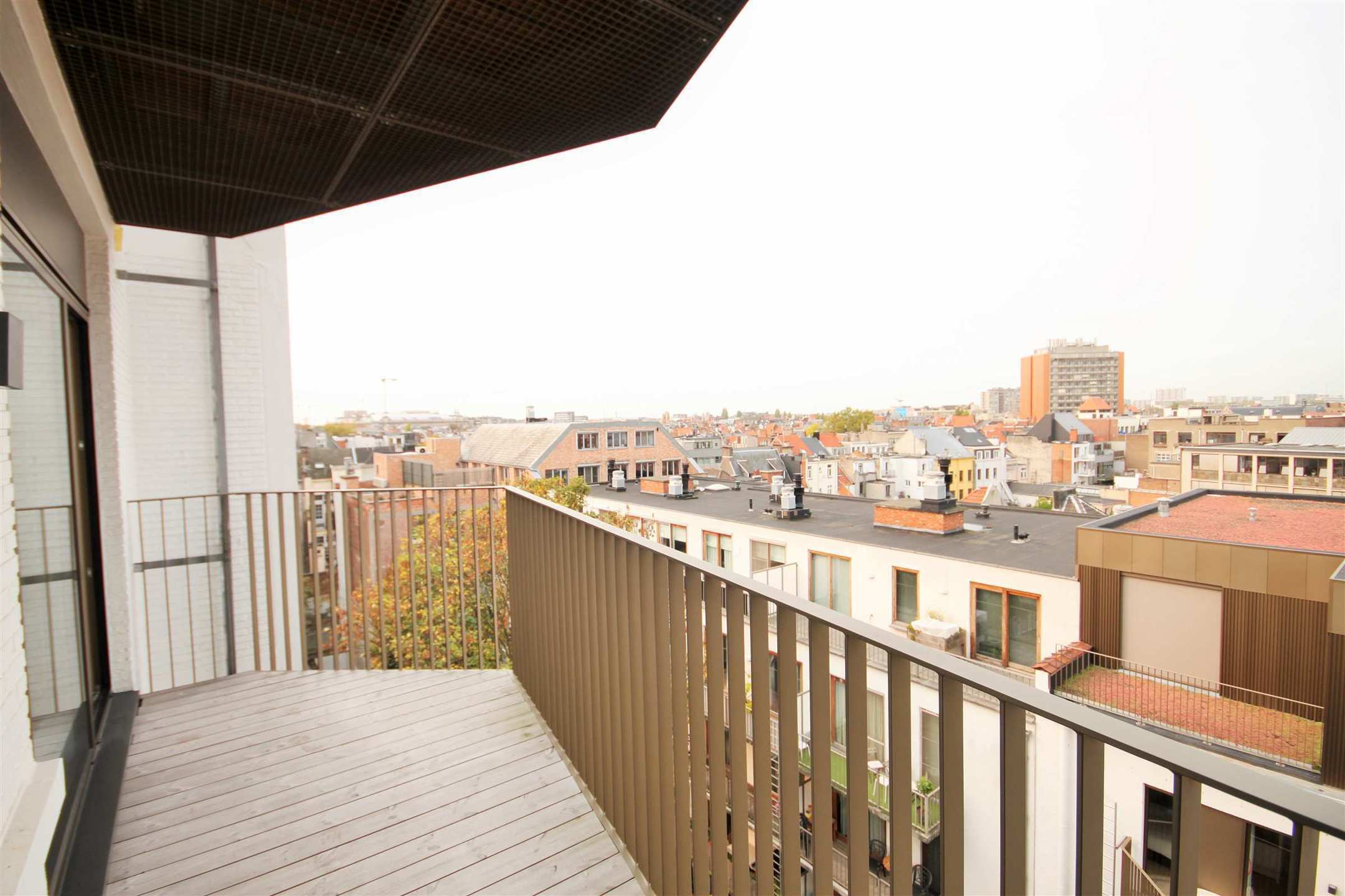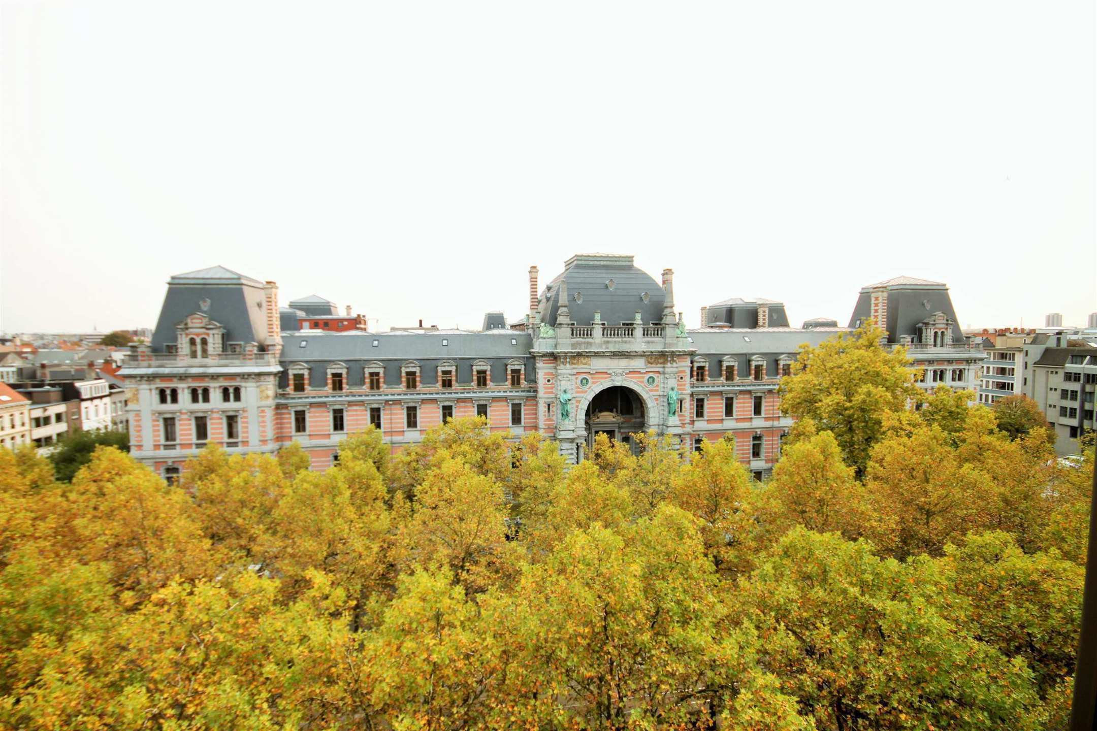 Het appartement bevindt zich op de 6e verdieping van het gebouw. We betreden het appartement in de inkomhal. Wat onmiddellijk opvalt is het prachtige zicht over het bladerendak van de Leien en het Oude Justitiepaleis. De leefruimte op parket van ca. 30m² staat in verbinding met de open keuken, dewelke ingericht is met een ijskast, oven, vaatwasser en elektrisch kookvuur.