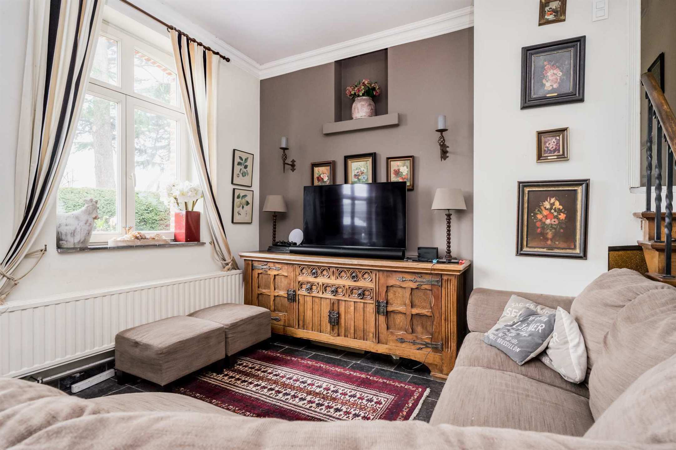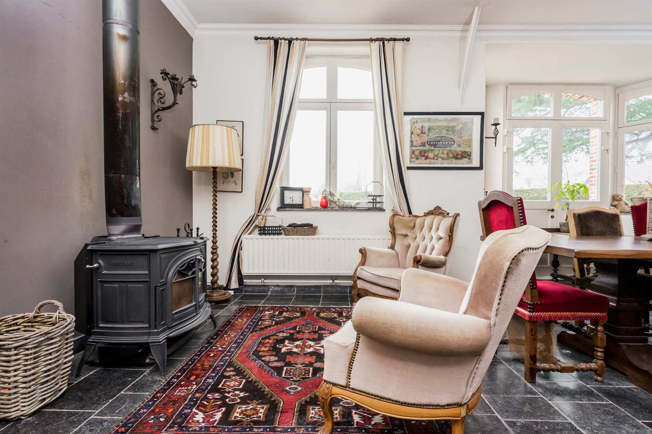 Via de majestueuze inkomhal betreed je de eerste sfeervolle leefruimte met open haard, perfect om te onthaasten. Aan de andere zijde van de woning bevindt zich een tweede, lichtrijke woon- en eetkamer met knusse kachel.