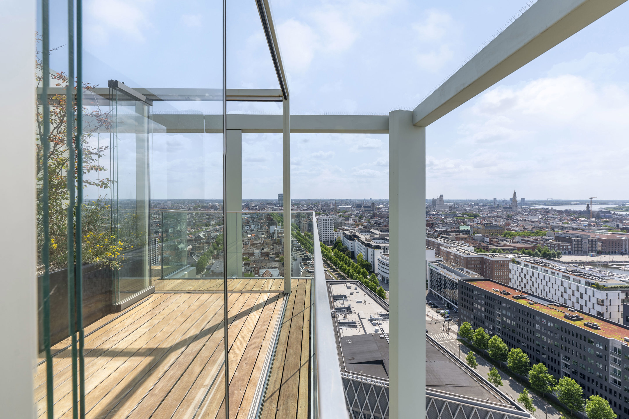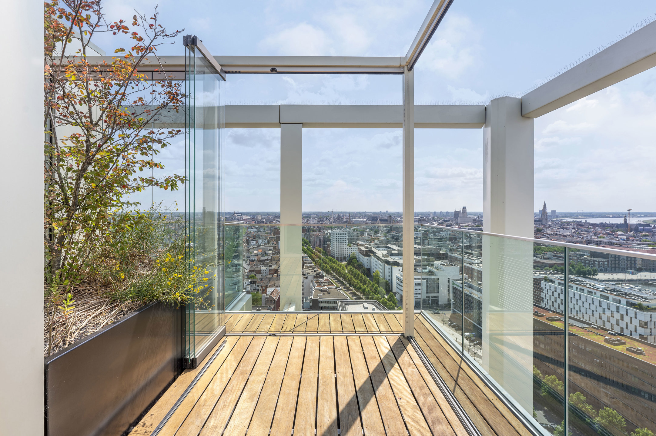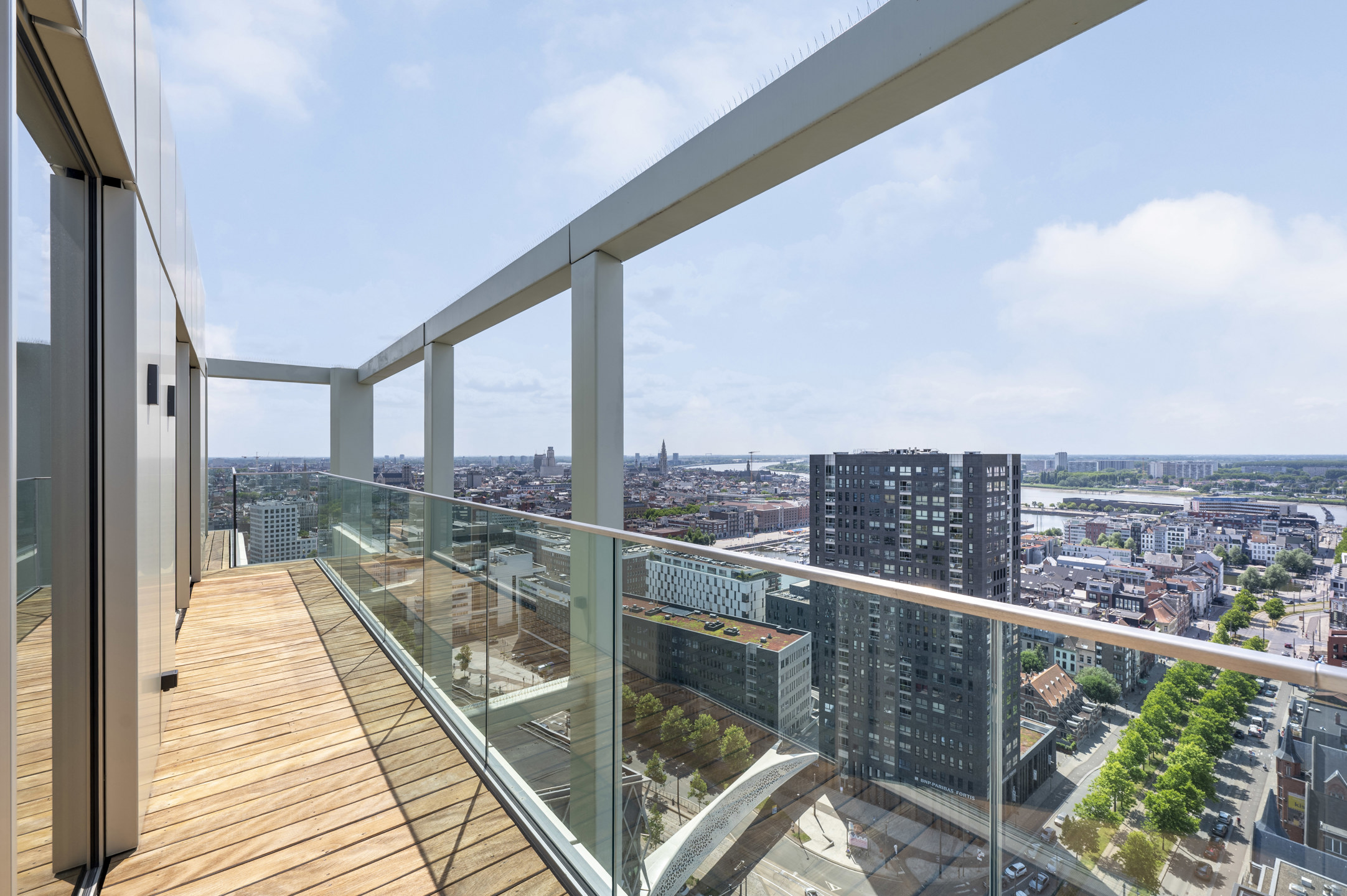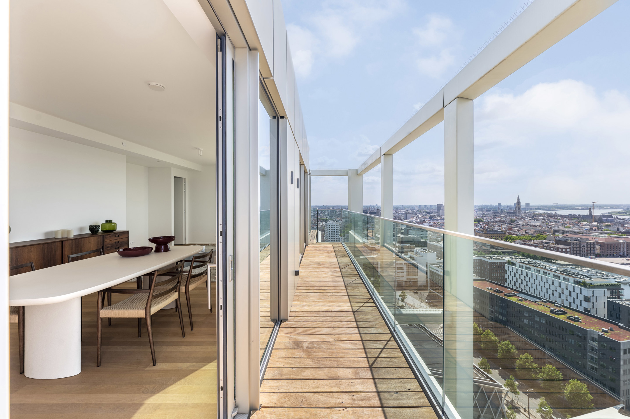 Directly adjacent is the terrace with breathtaking view of the city / full Scheldt bend / port. Part of the terrace is equipped with a glass curtain so that one can fully enjoy the terrace even in strong winds.