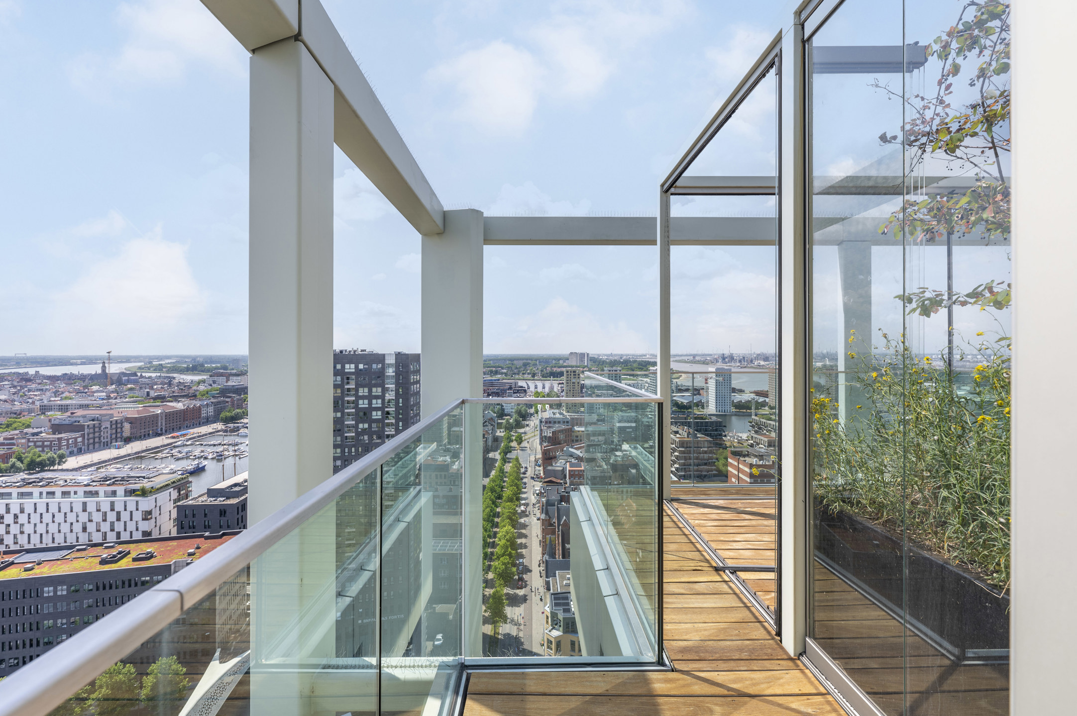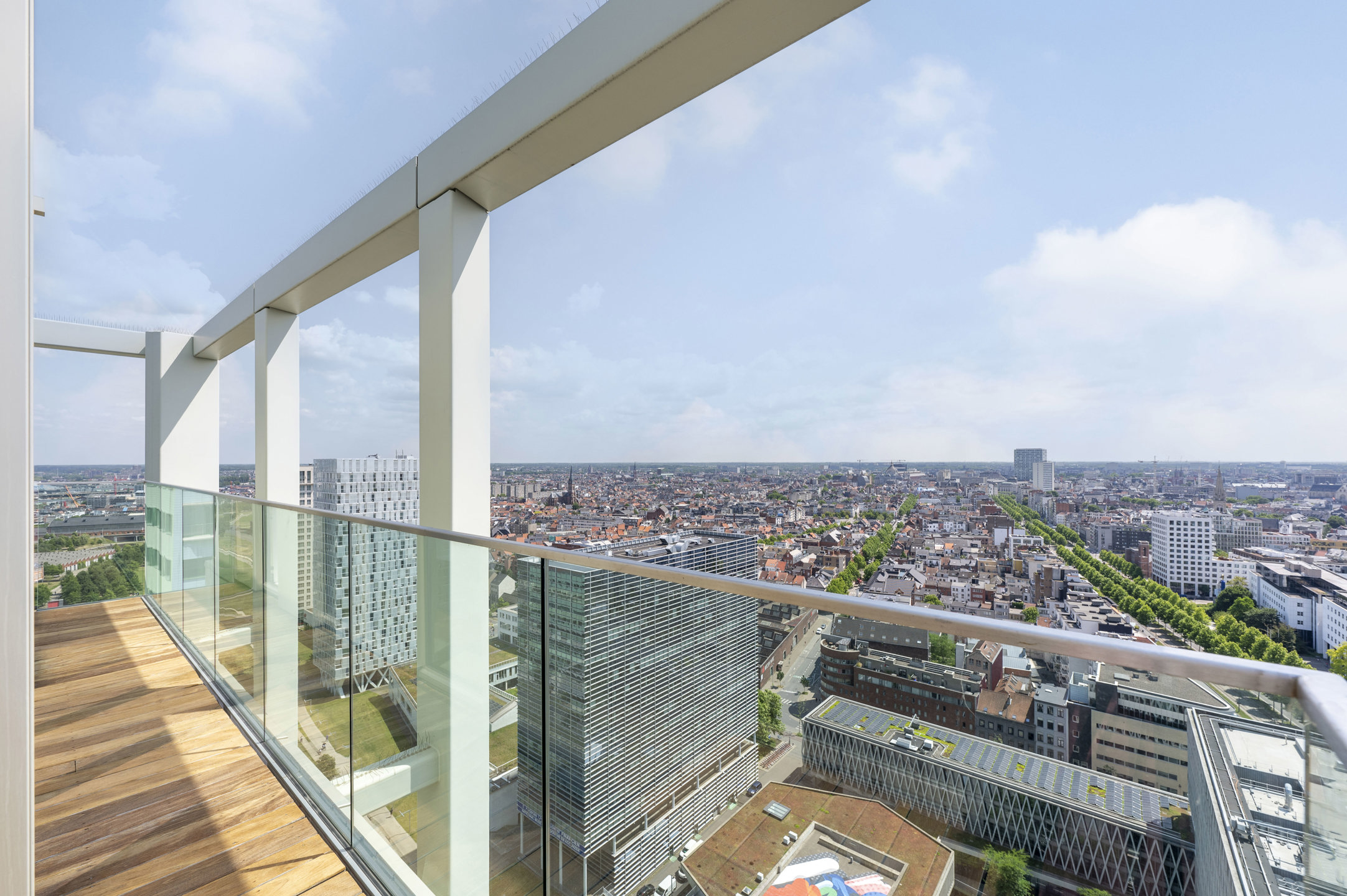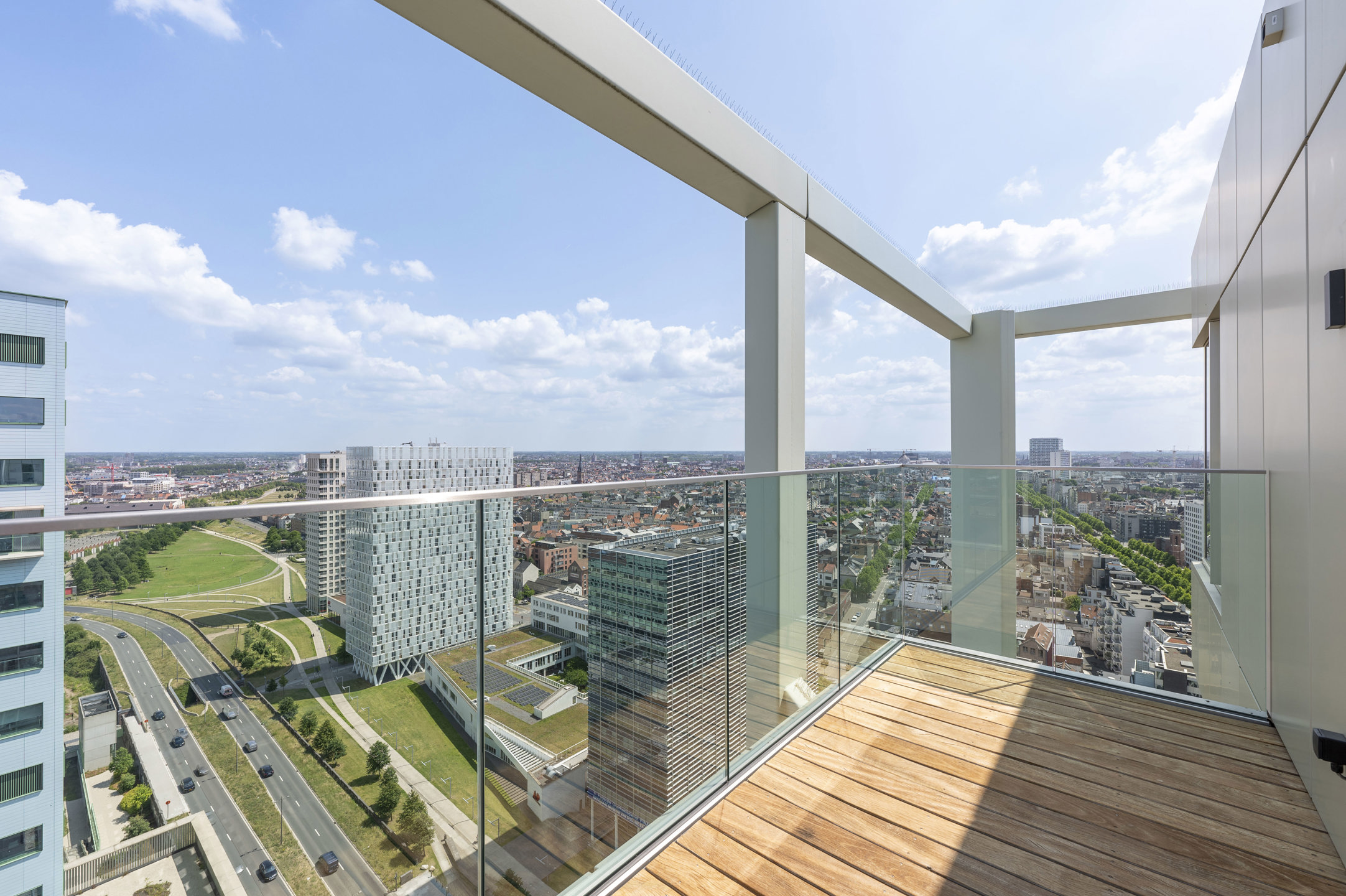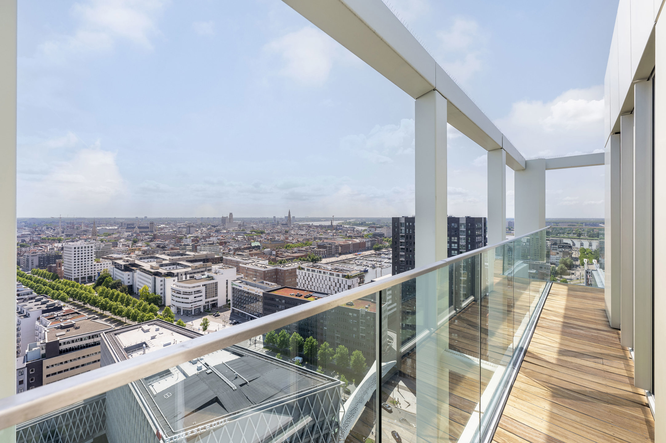 Directly adjacent is the terrace with breathtaking view of the city / full Scheldt bend / port. Part of the terrace is equipped with a glass curtain so that one can fully enjoy the terrace even in strong winds.