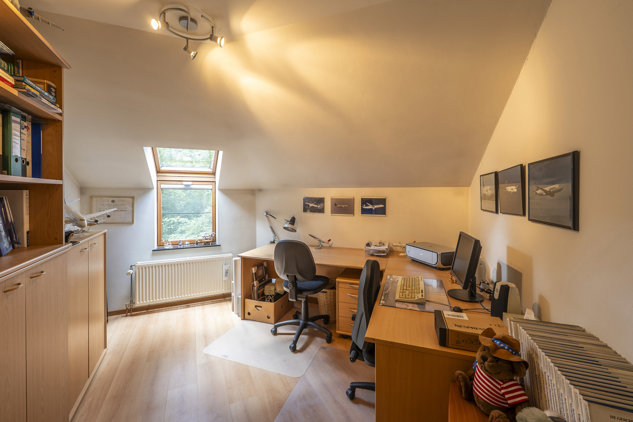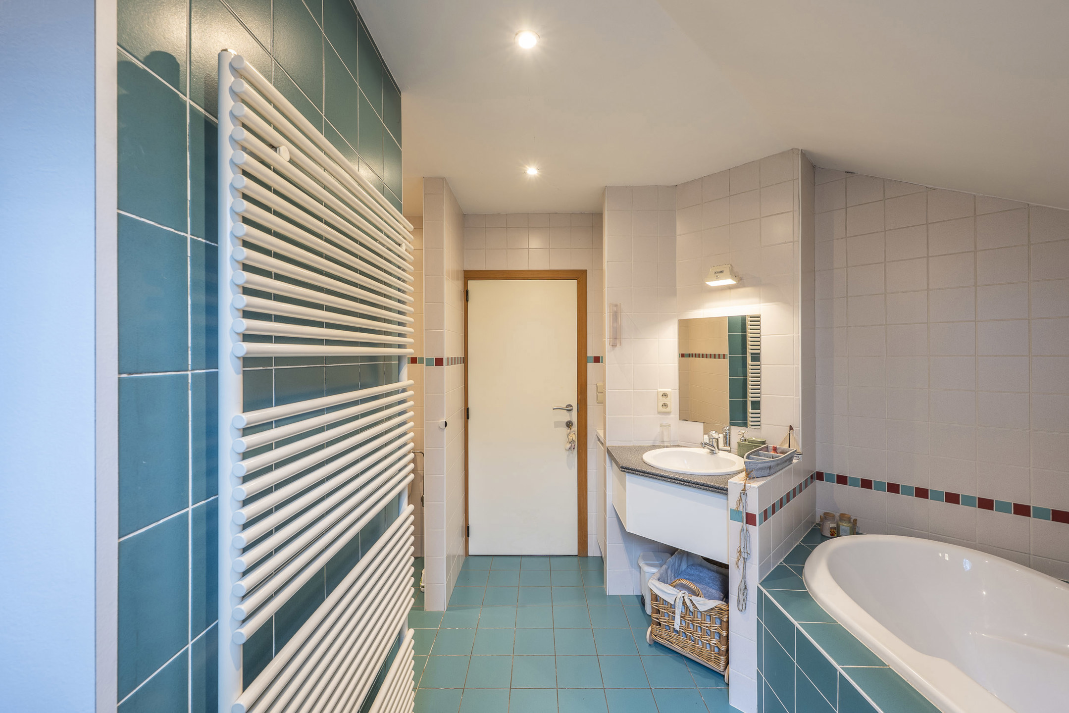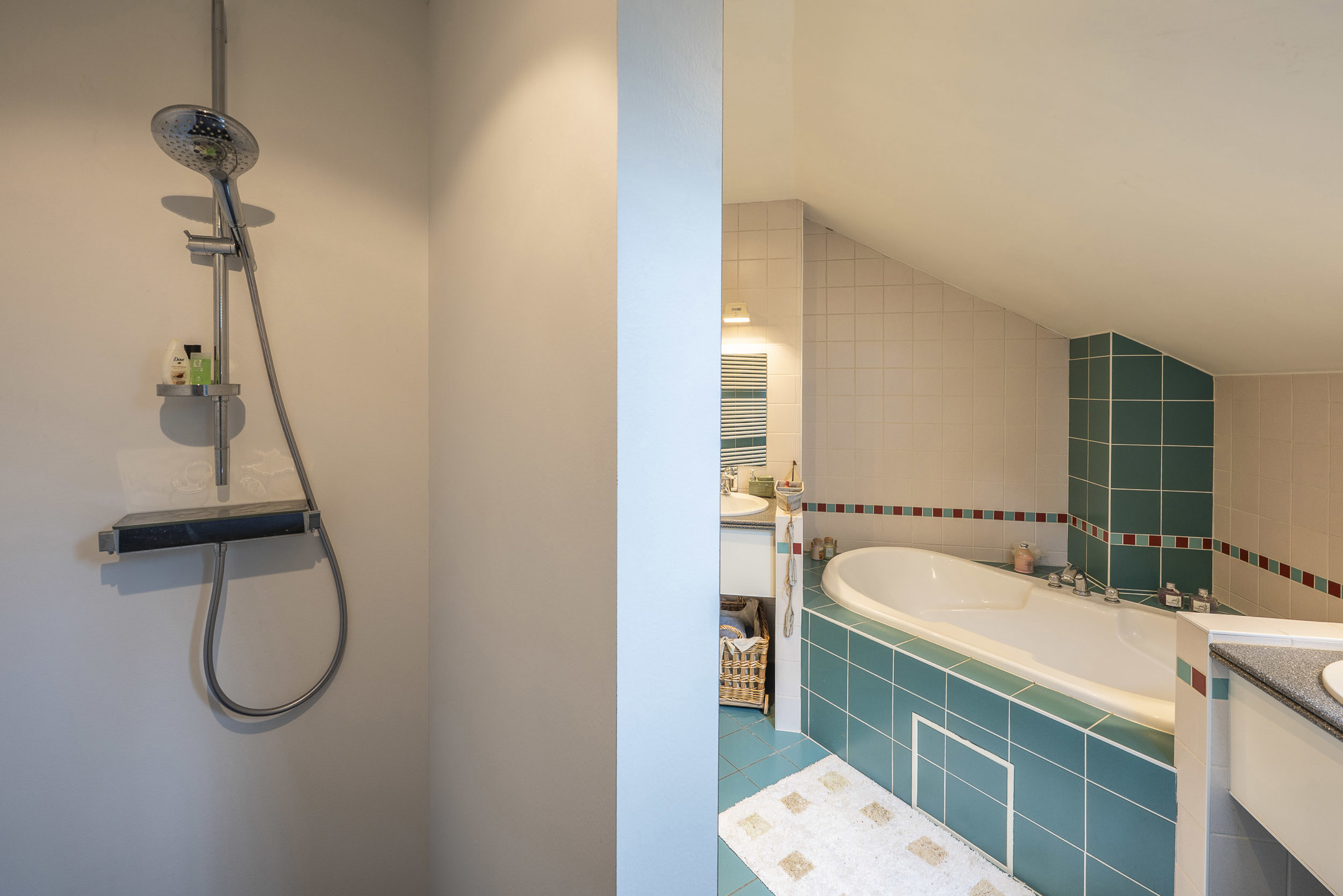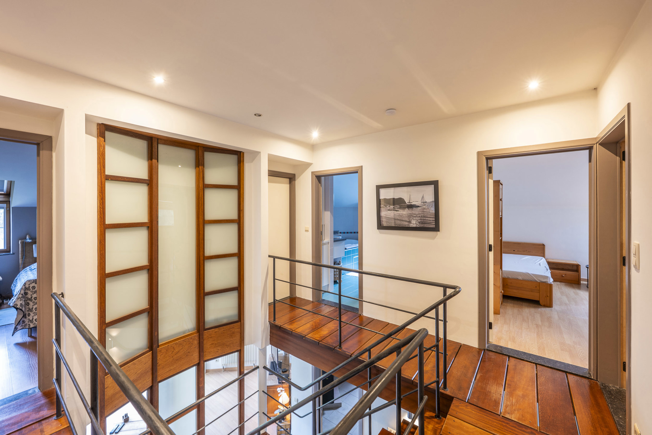 De centrale traphal leidt naar de eerste verdieping, waar je zes kamers en een comfortabele badkamer met inloopdouche en ligbad aantreft.