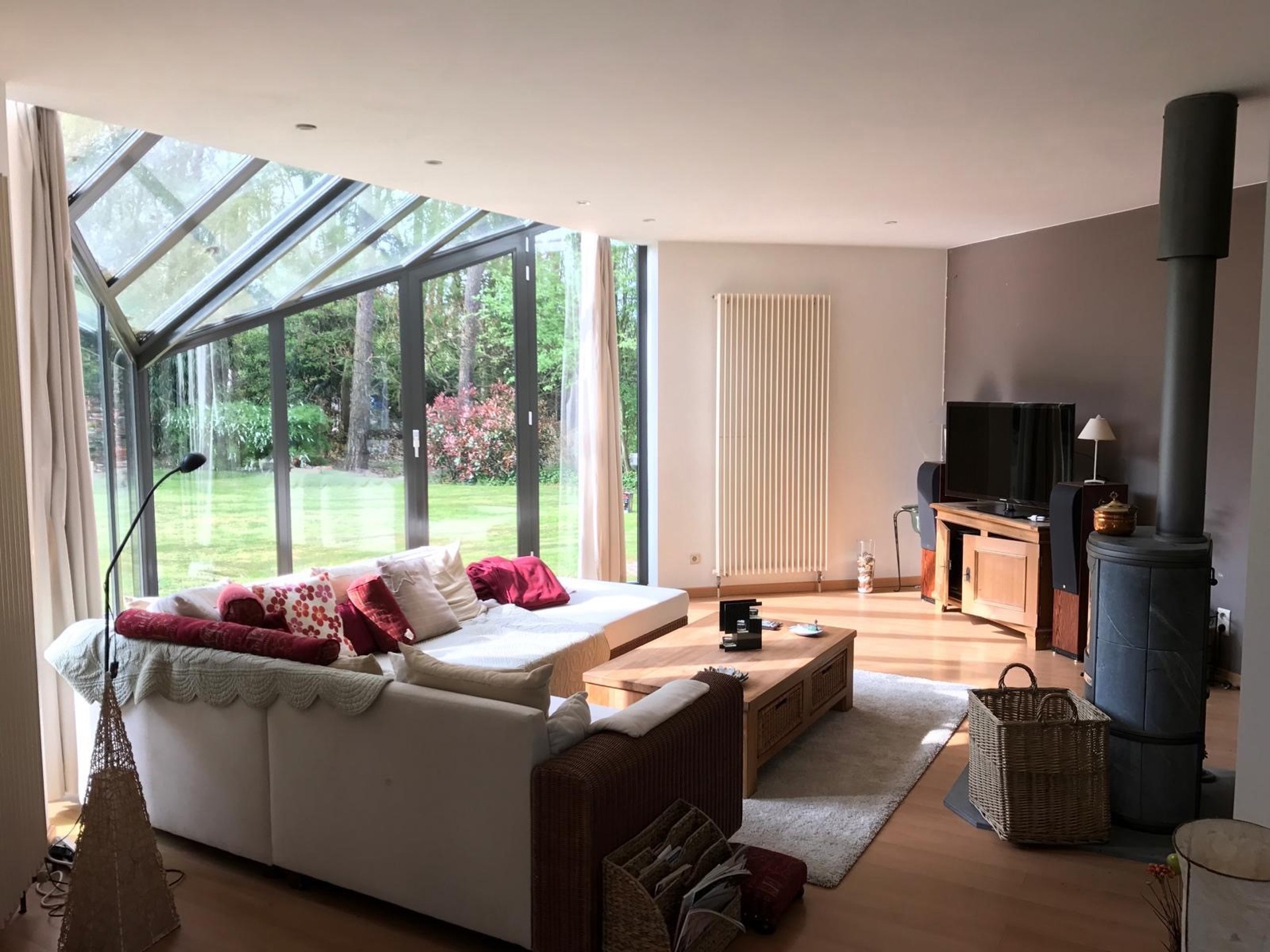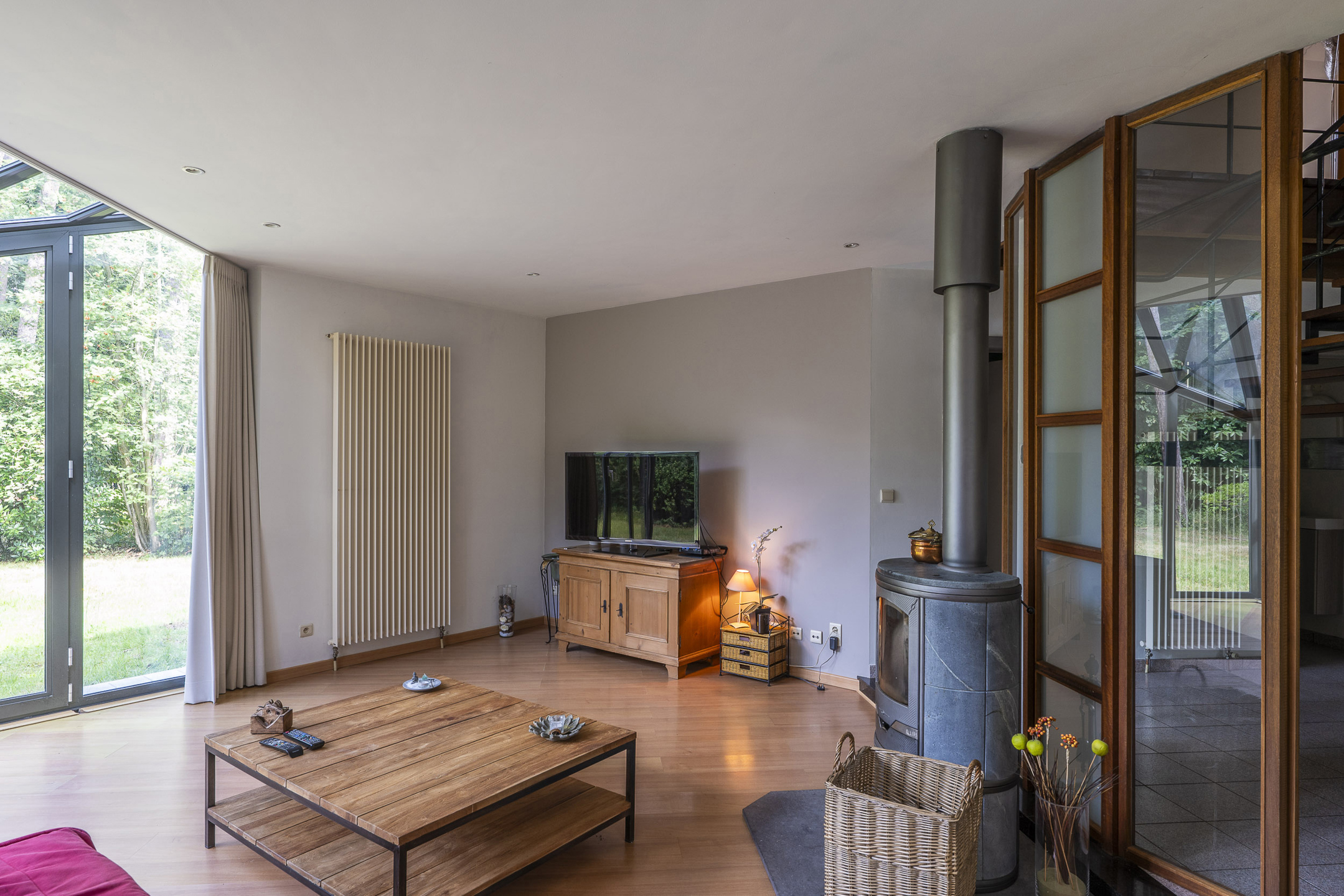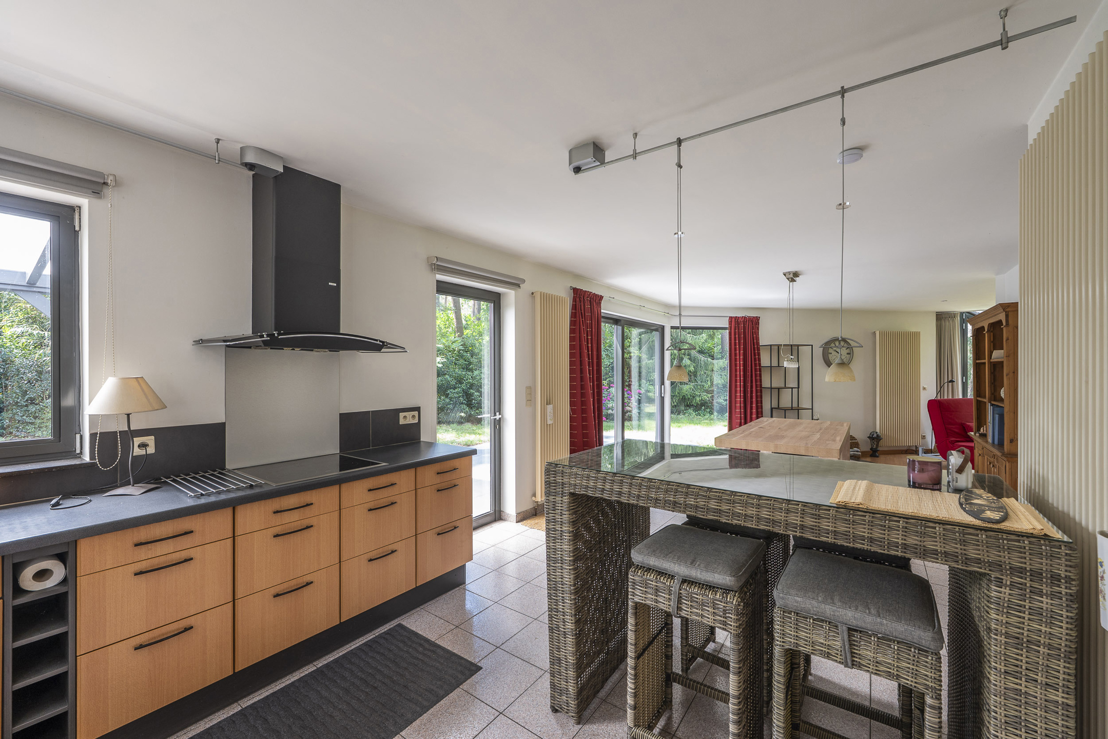 De woning werd gebouwd in 1992 en biedt vandaag een bewoonbare oppervlakte van 283 m². Binnen kom je terecht in een warme, gezellige leefruimte met een glazen erker die uitkijkt op het omliggende groen. De houtkachel in speksteen zorgt voor extra sfeer en comfort. De open keuken sluit naadloos aan op deze leefruimte en kijkt uit op de tuin. Via de keuken heb je toegang tot een overdekt terras, perfect om het hele jaar door van het buitenleven te genieten.
