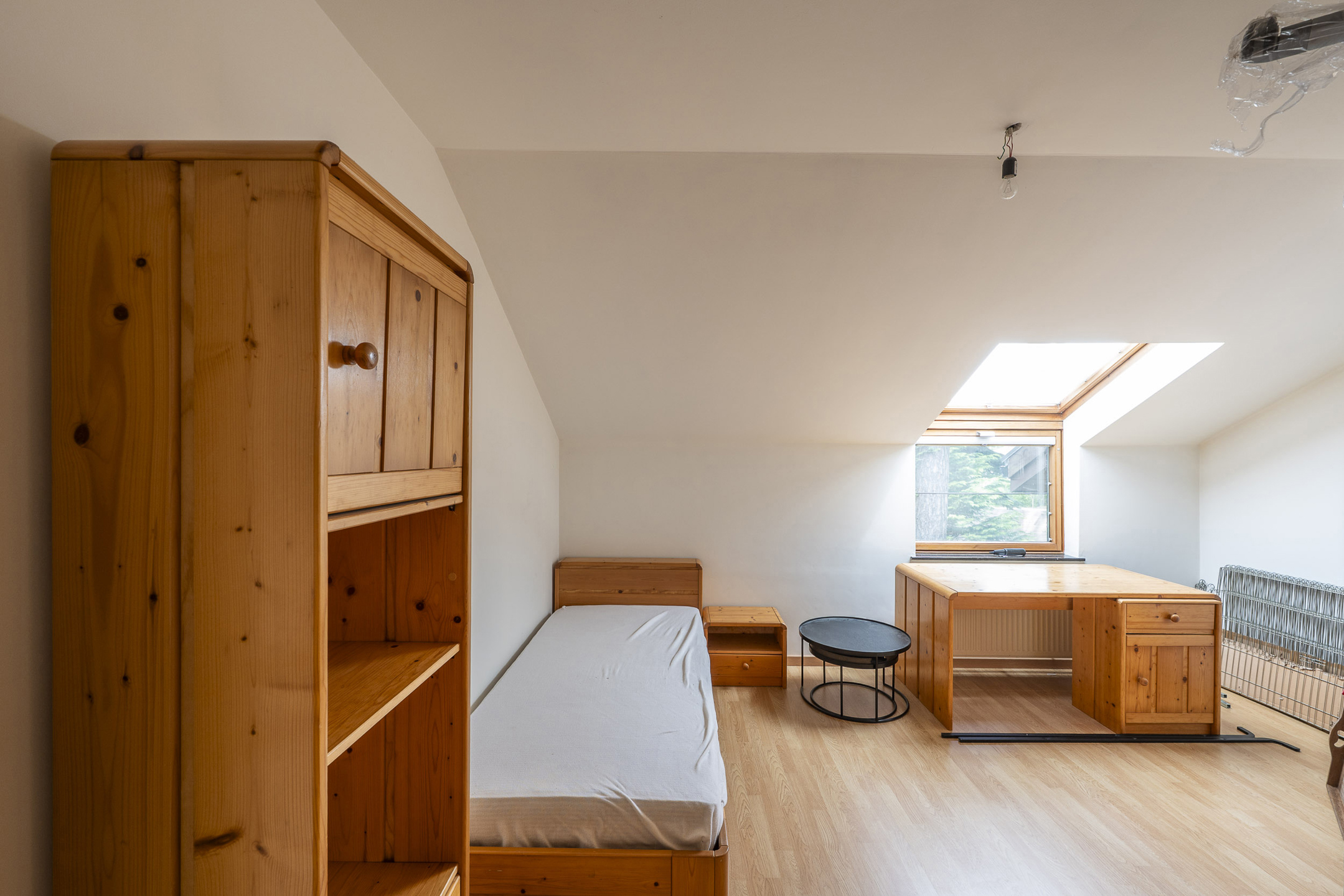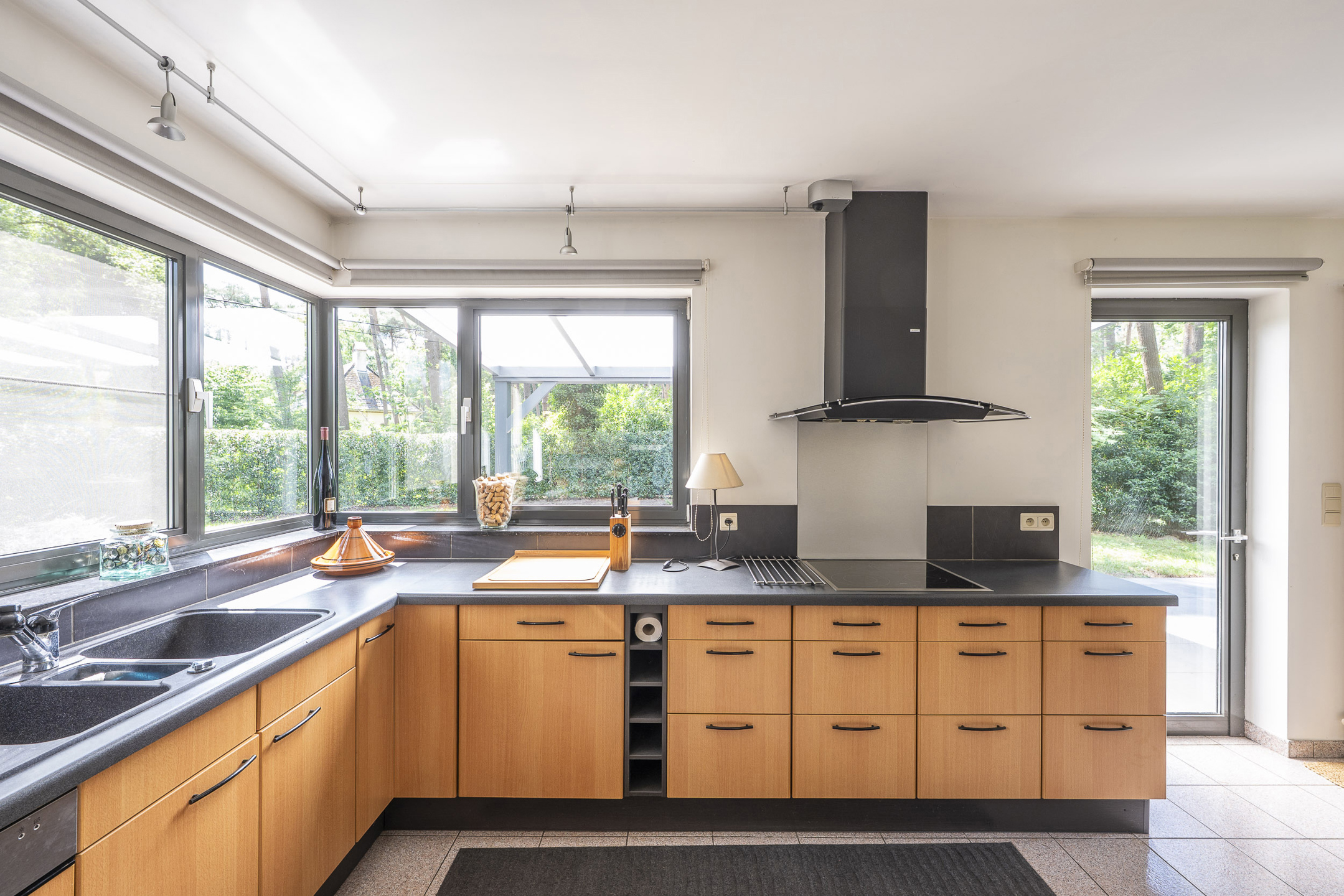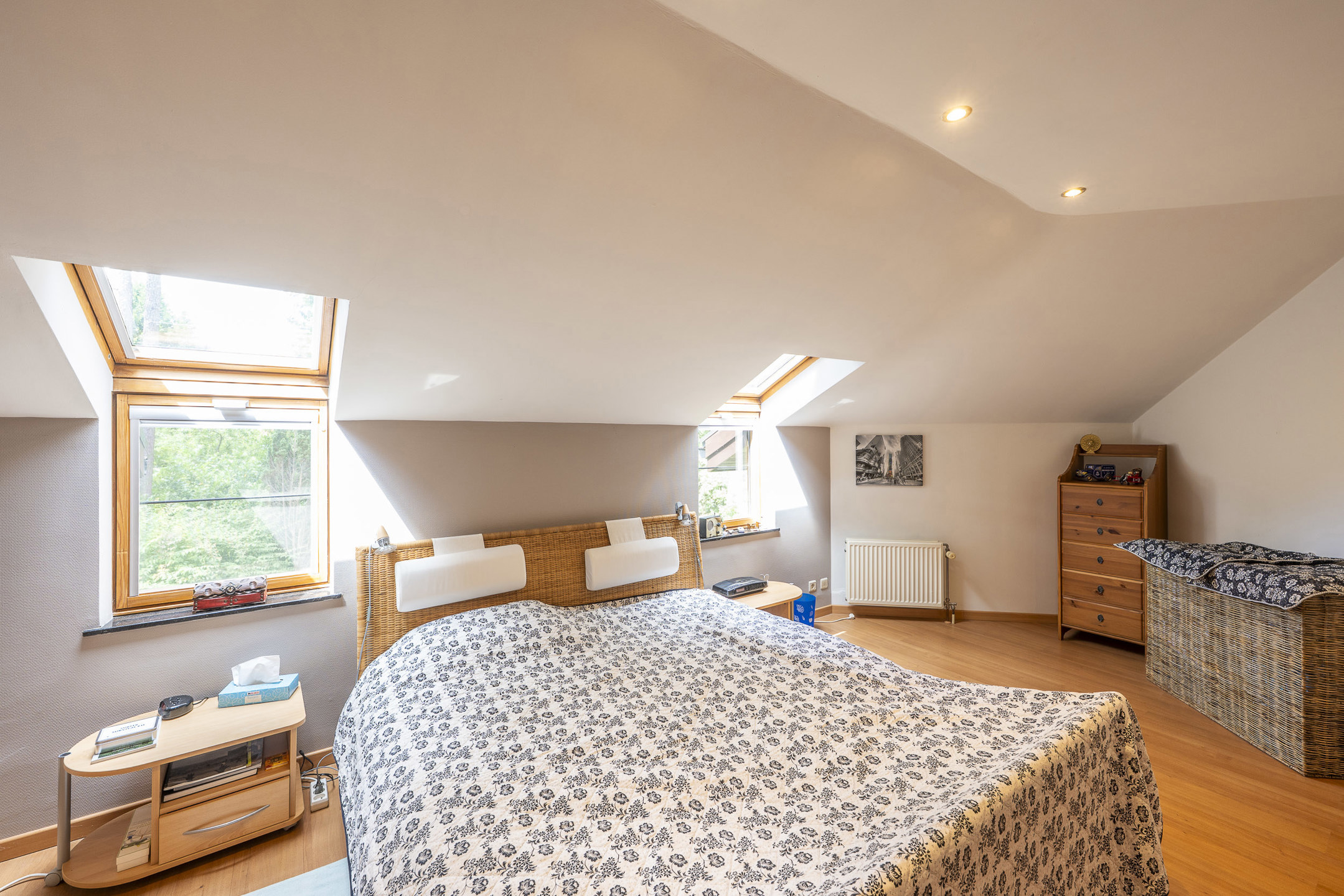 De woning werd gebouwd in 1992 en biedt vandaag een bewoonbare oppervlakte van 283 m². Binnen kom je terecht in een warme, gezellige leefruimte met een glazen erker die uitkijkt op het omliggende groen. De houtkachel in speksteen zorgt voor extra sfeer en comfort. De open keuken sluit naadloos aan op deze leefruimte en kijkt uit op de tuin. Via de keuken heb je toegang tot een overdekt terras, perfect om het hele jaar door van het buitenleven te genieten.