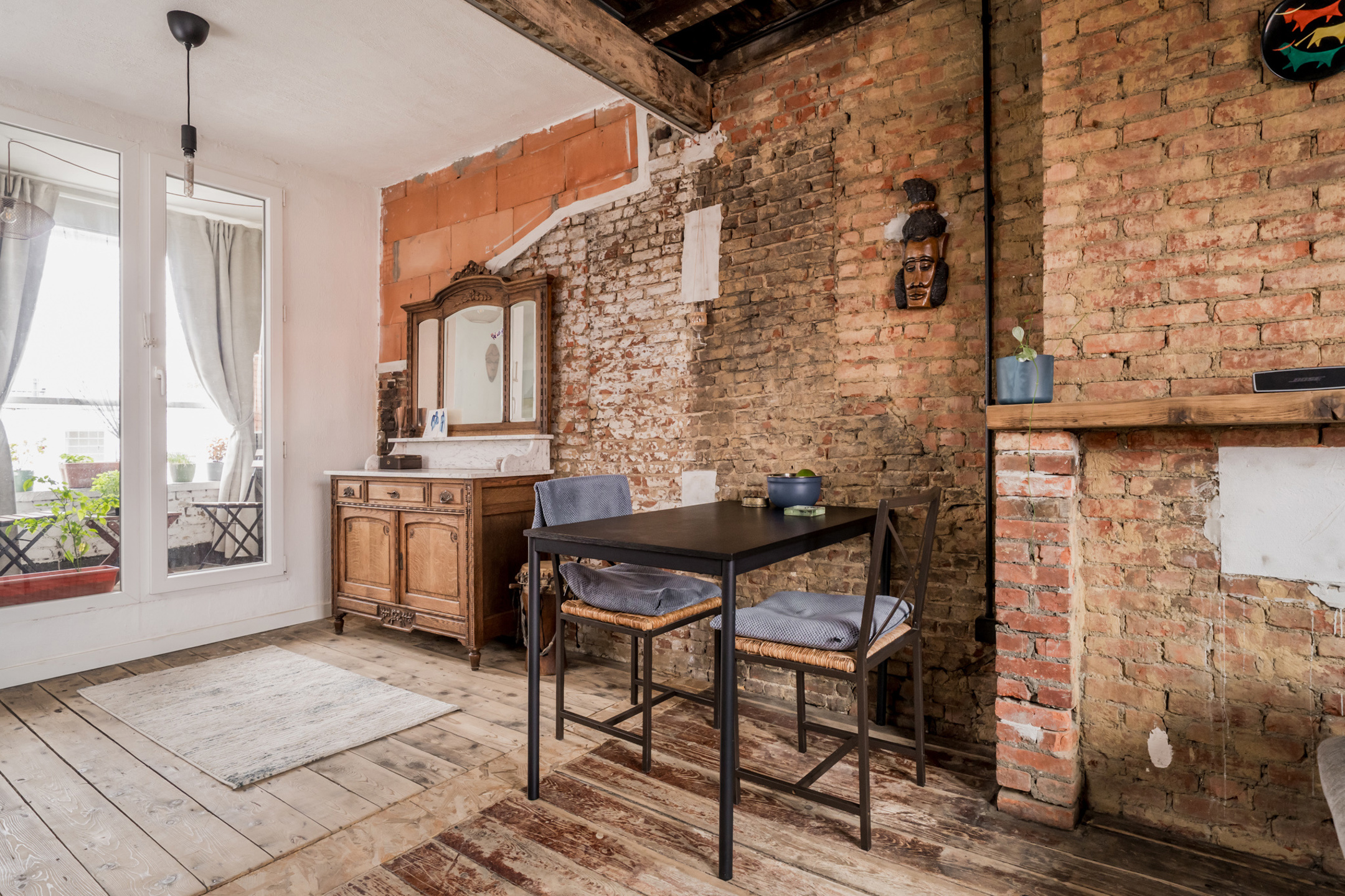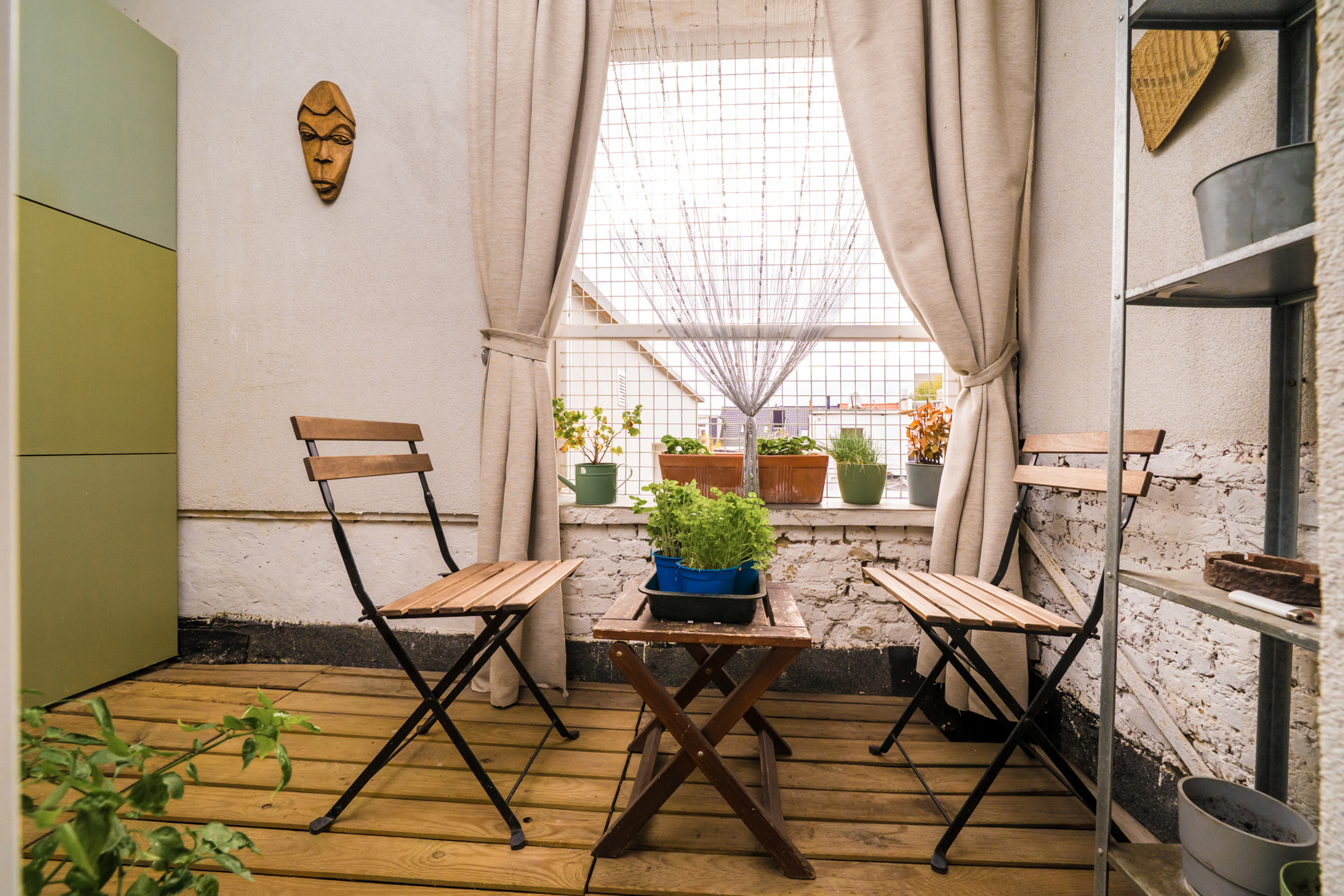 Vanuit de leefruimte heb je toegang tot een klein inpandig terrasje — een knusse buitenruimte waar je even kan ontspannen of genieten van een koffiemoment.