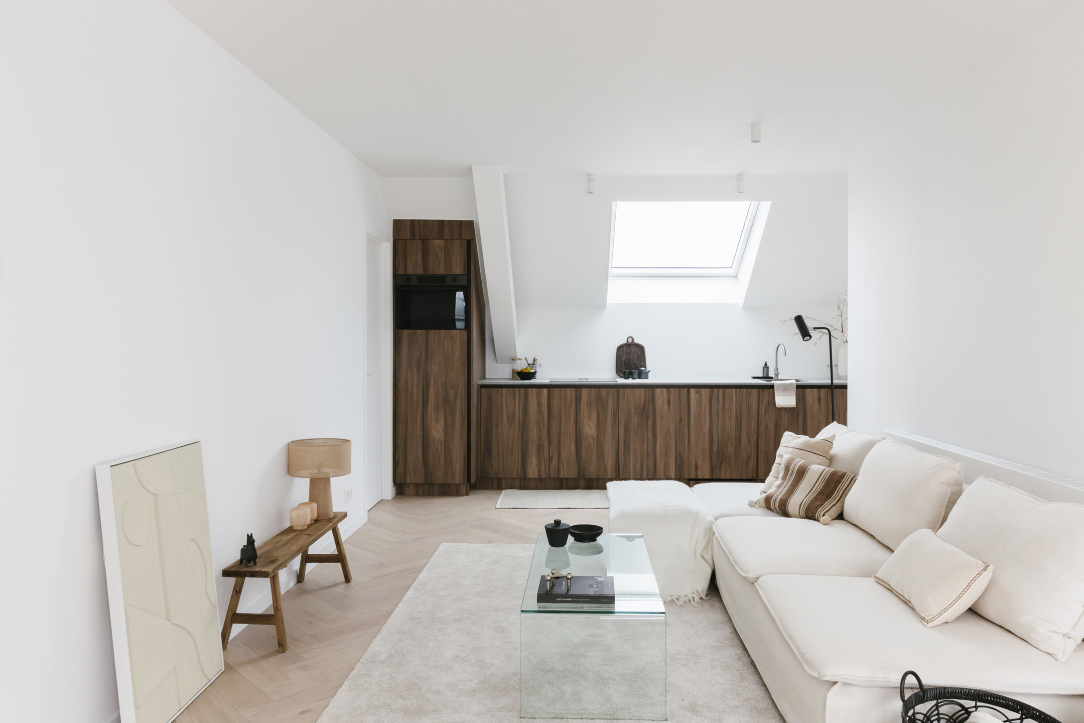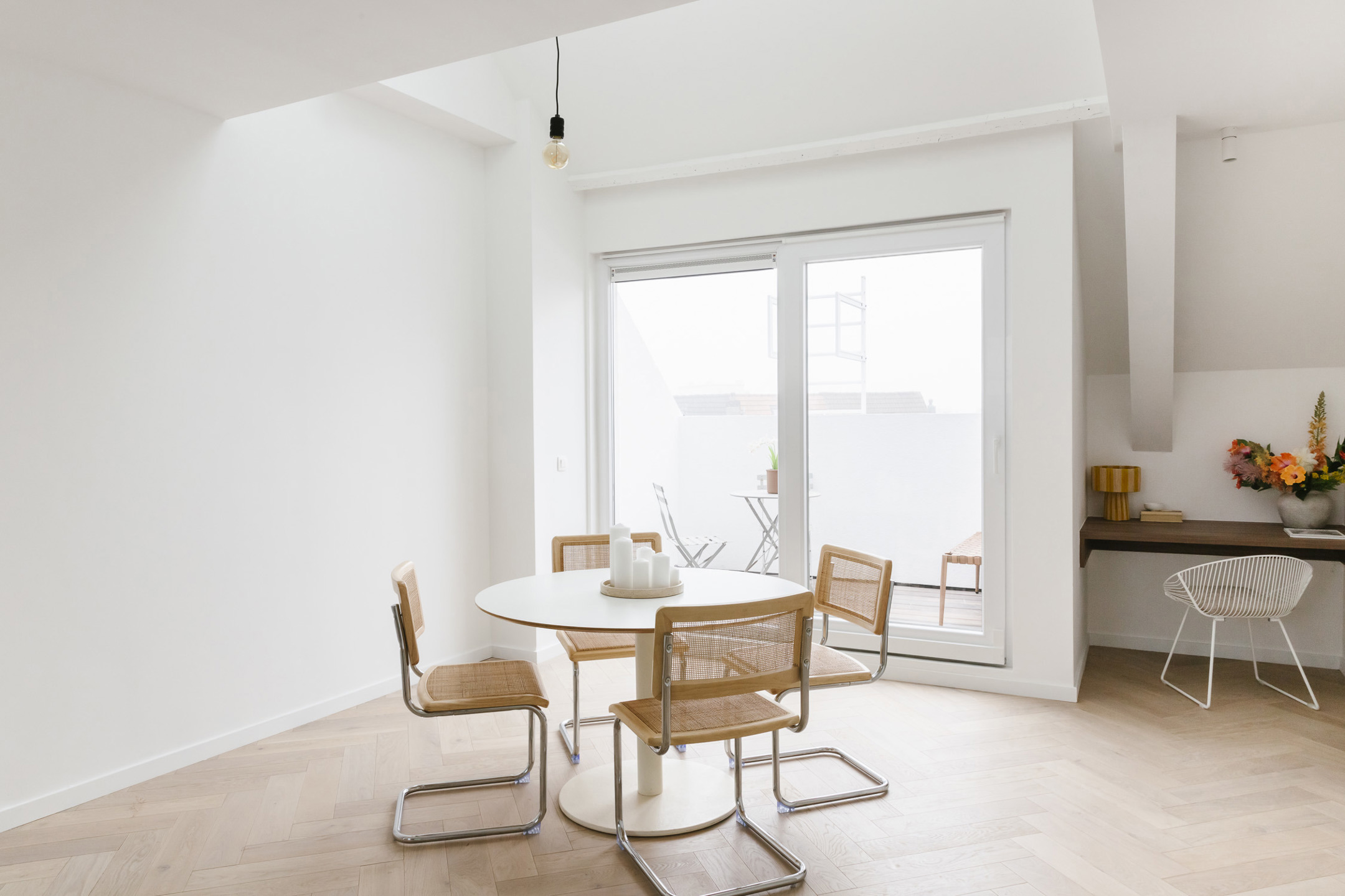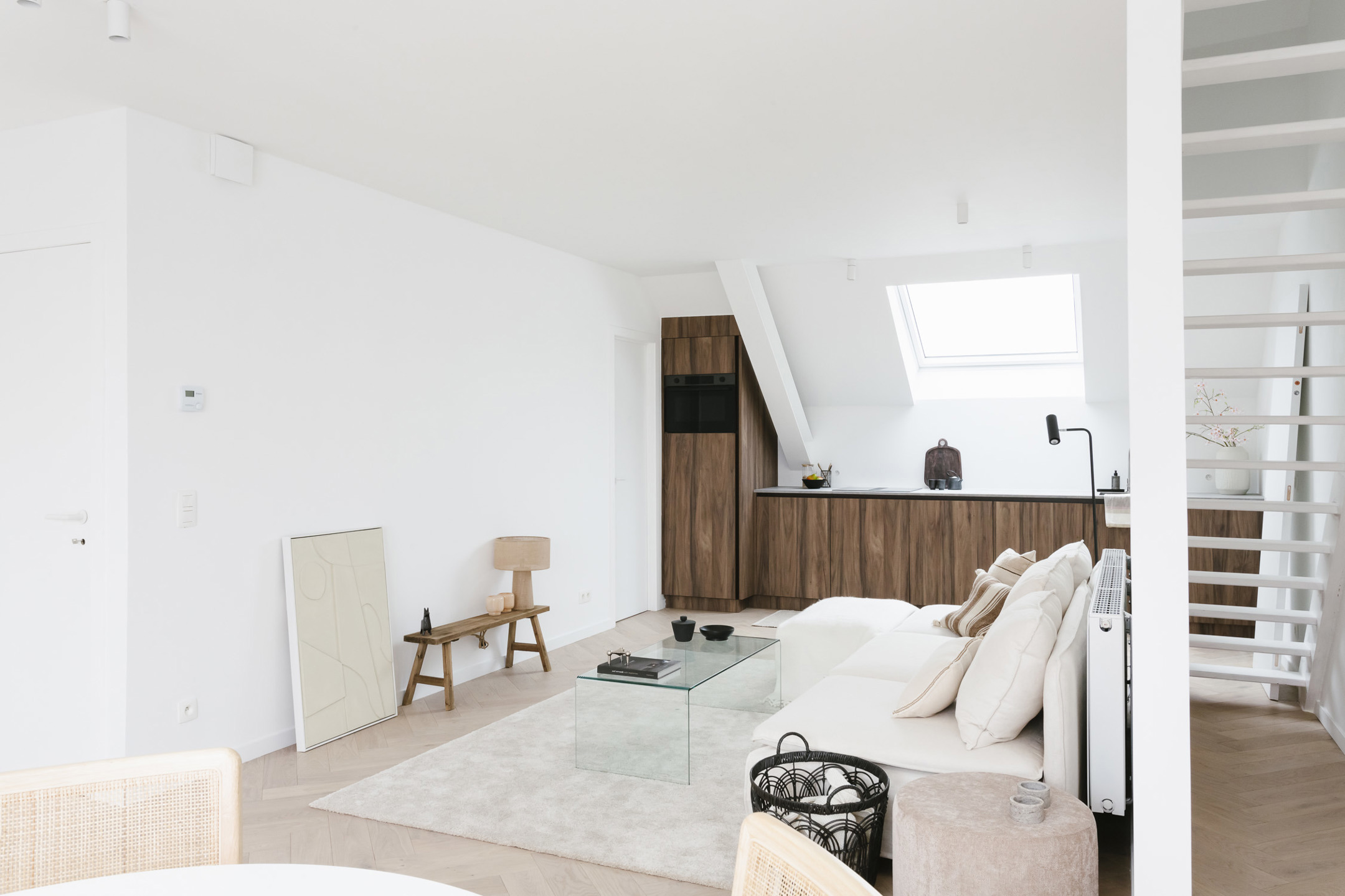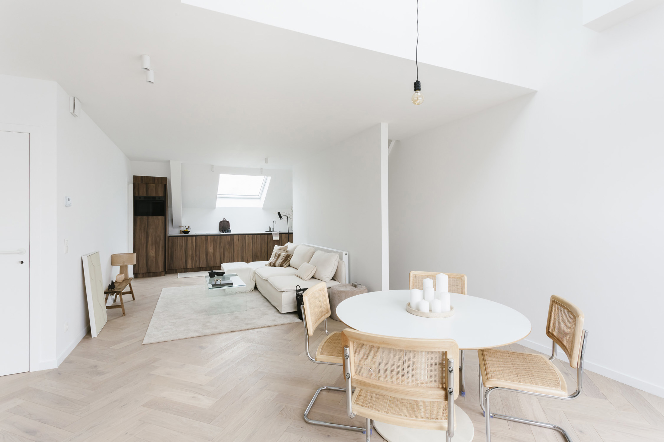 Bij het binnenkomen betreed je meteen de sfeervolle leefruimte. Naast de inkom bevindt zich een apart gastentoilet en een praktische berging. De leefruimte sluit naadloos aan op de open, volledig geïnstalleerde keuken en geeft rechtstreeks toegang tot het terras, ideaal voor een ontbijt, een aperitief met vrienden of een rustig moment in alle privacy, midden in de stad.