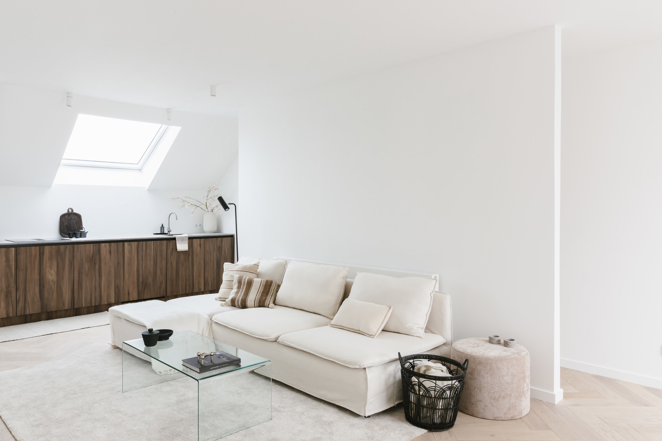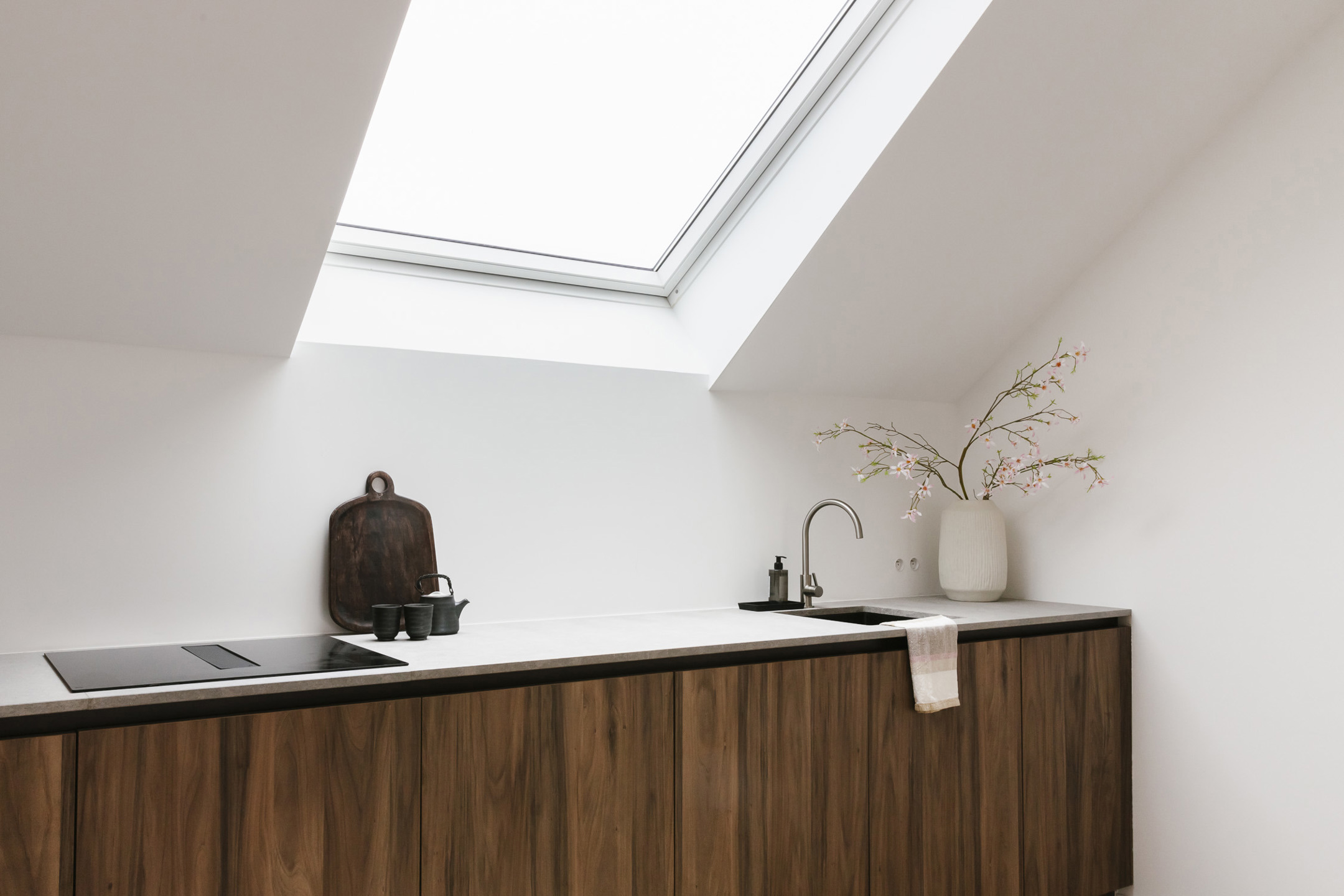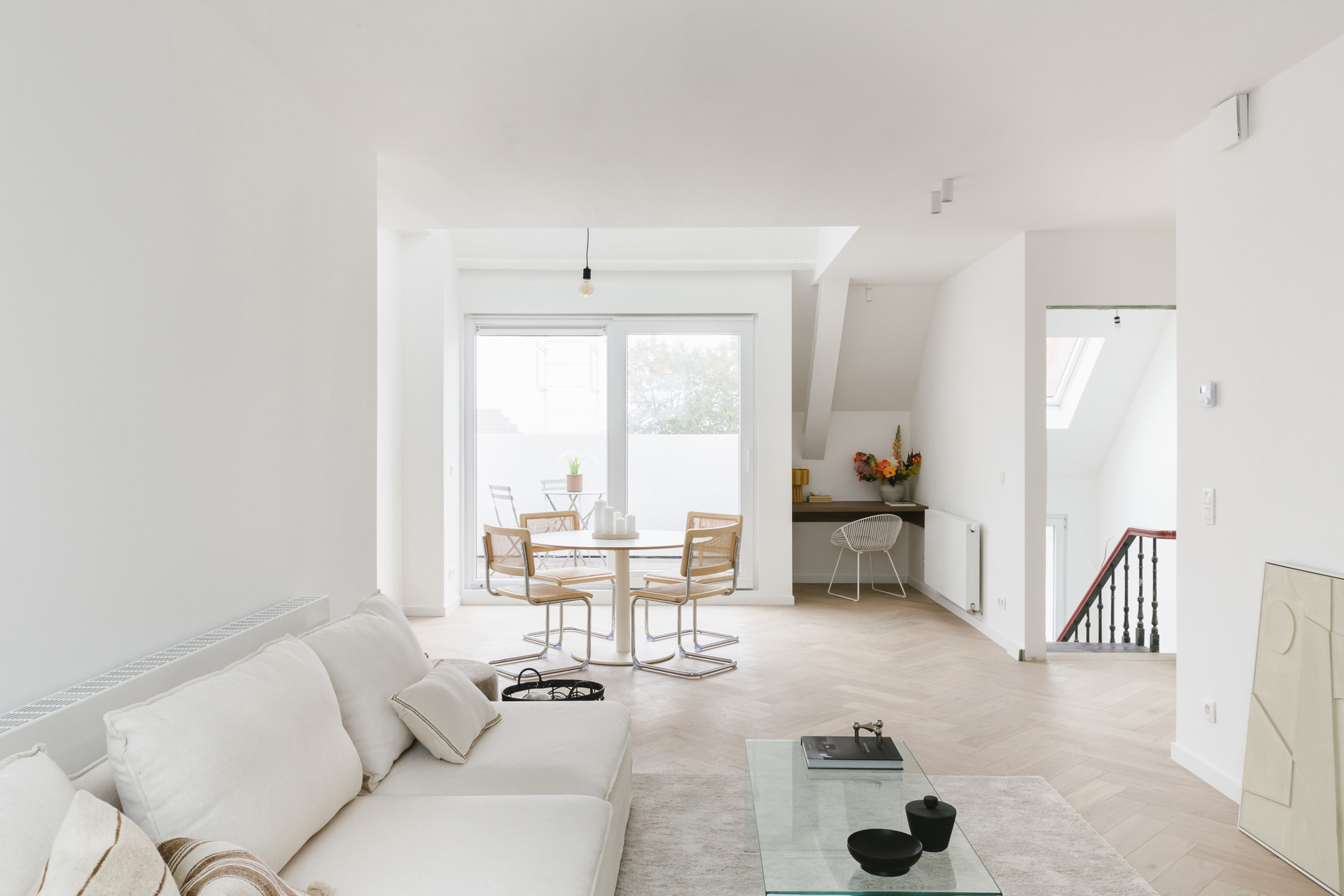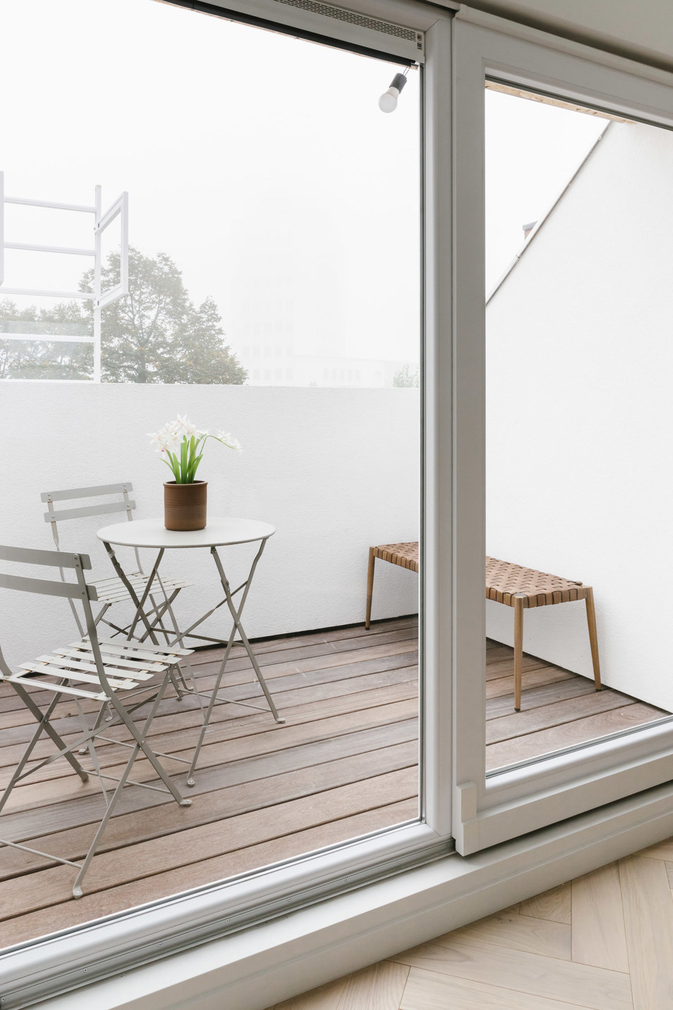 Bij het binnenkomen betreed je meteen de sfeervolle leefruimte. Naast de inkom bevindt zich een apart gastentoilet en een praktische berging. De leefruimte sluit naadloos aan op de open, volledig geïnstalleerde keuken en geeft rechtstreeks toegang tot het terras, ideaal voor een ontbijt, een aperitief met vrienden of een rustig moment in alle privacy, midden in de stad.