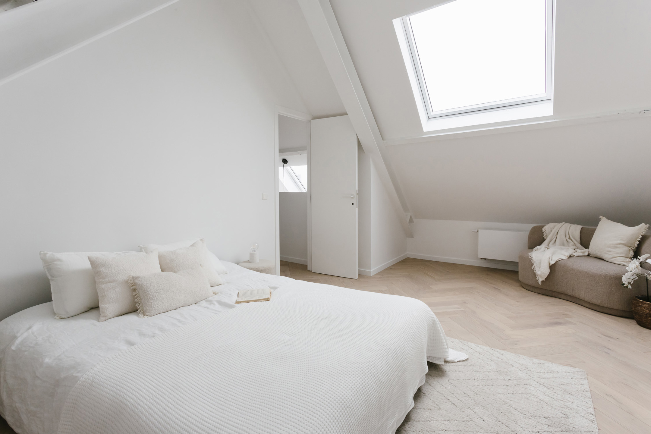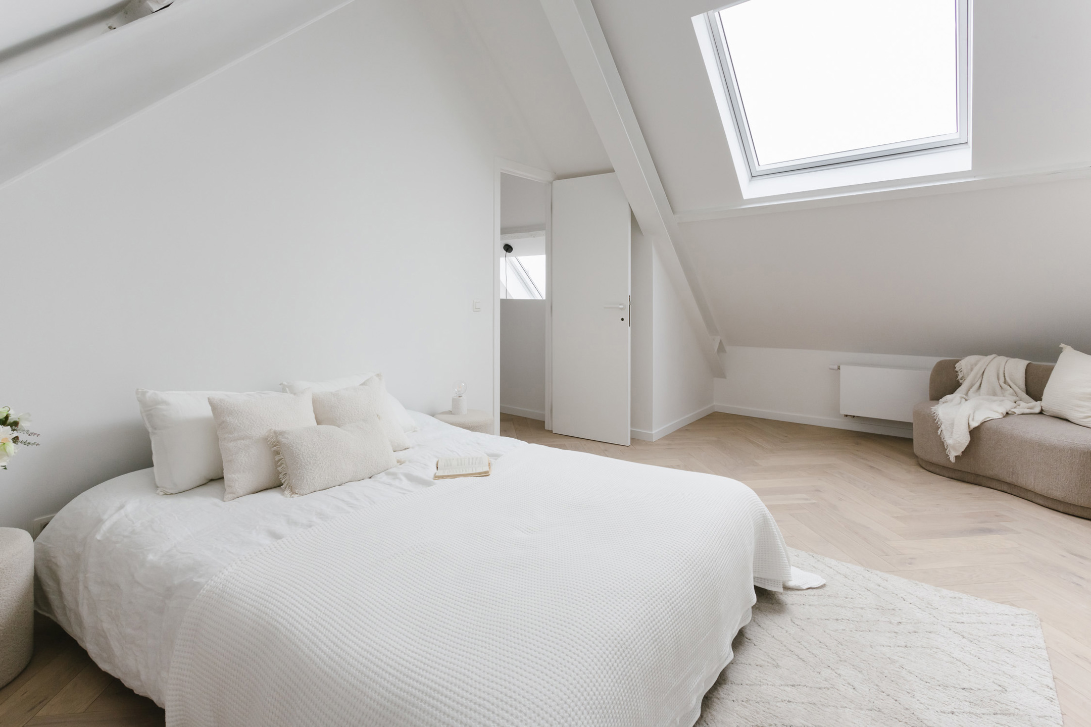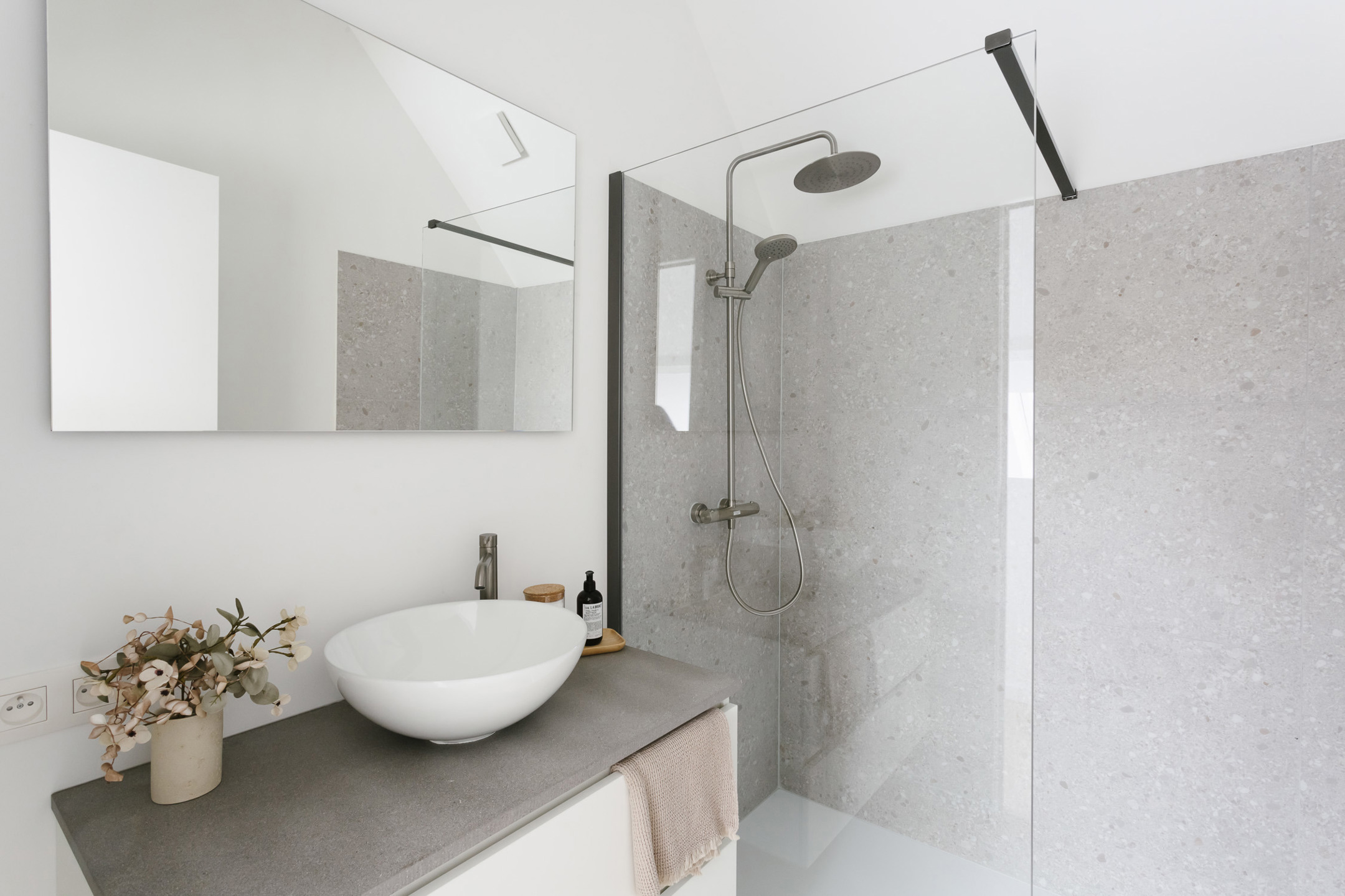 Op de verdieping bevindt zich de master bedroom samen met de badkamer, uitgerust met een moderne inloopdouche en een verfijnd badkamermeubel.