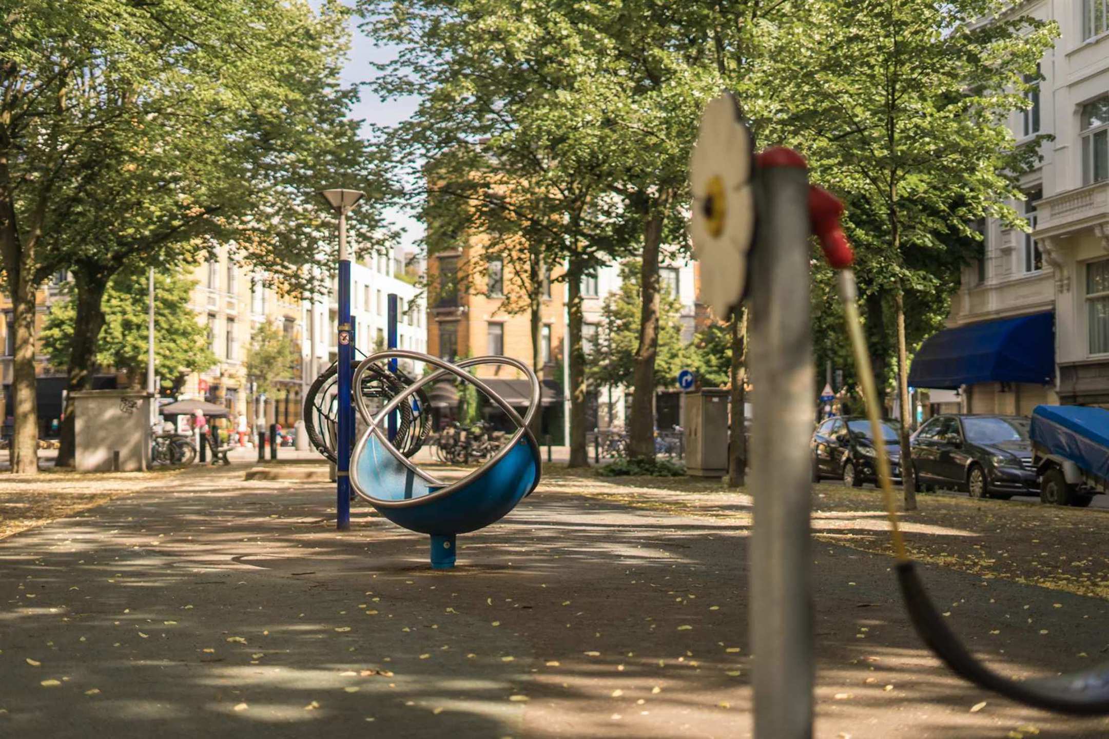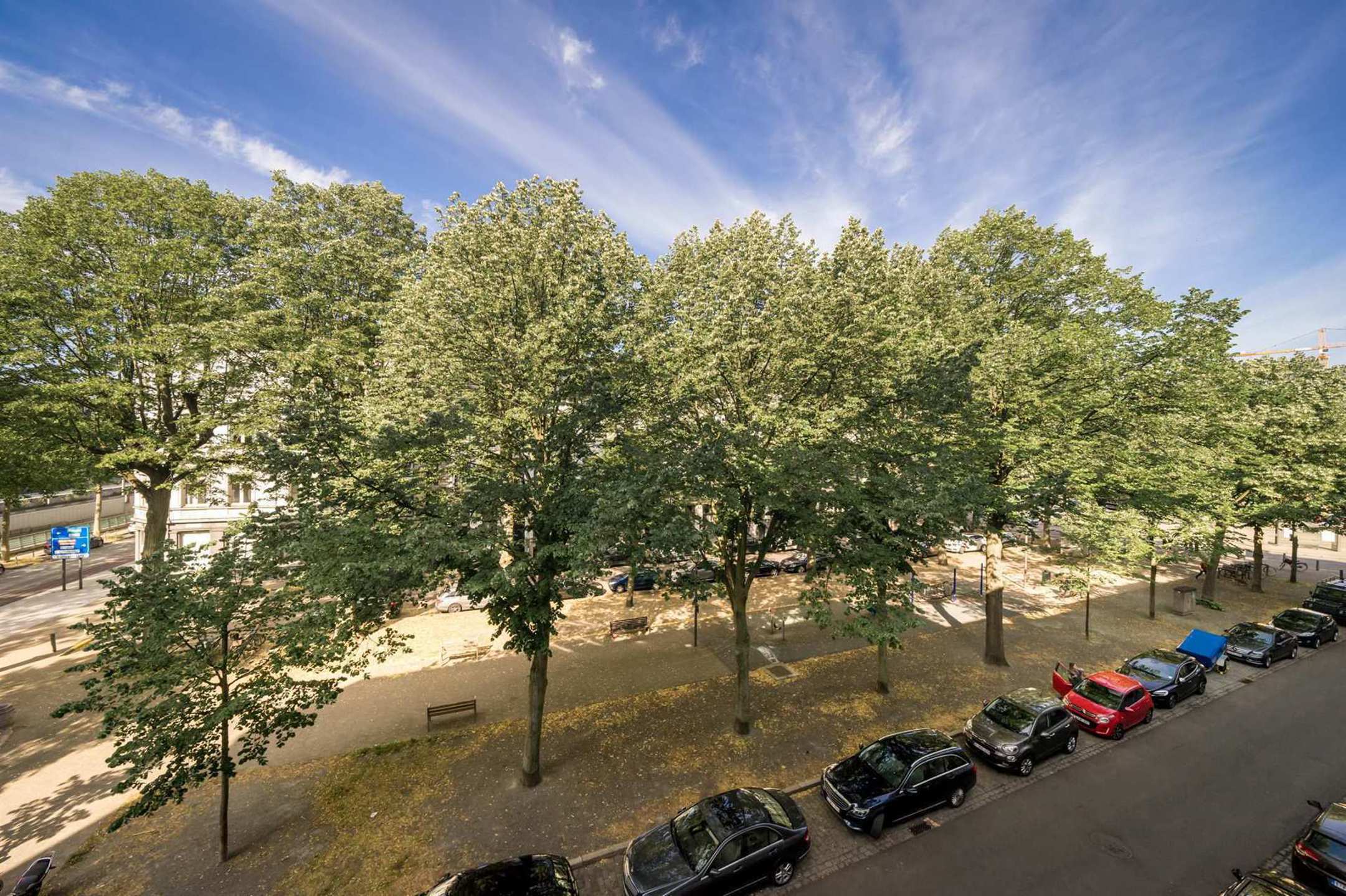 Via de lift bereikt men dit appartement op de 3de verdieping. In de inkomhal bevindt zich de ingemaakte vestiaire, het hangtoilet met handenwasser en de bergruimte met aansluiting voor de wasmachine. De ruime living op parket biedt een mooi zicht op het groene plein. Aansluitend bevindt zich de volledig gerenoveerde keuken, voorzien van ingemaakte kasten in betonplex en nieuwe AEG toestellen (inductiekookvuur met ingebouwde afzuiging, ruime ijskast met vershoudlades, vaatwasser en warme luchtoven).