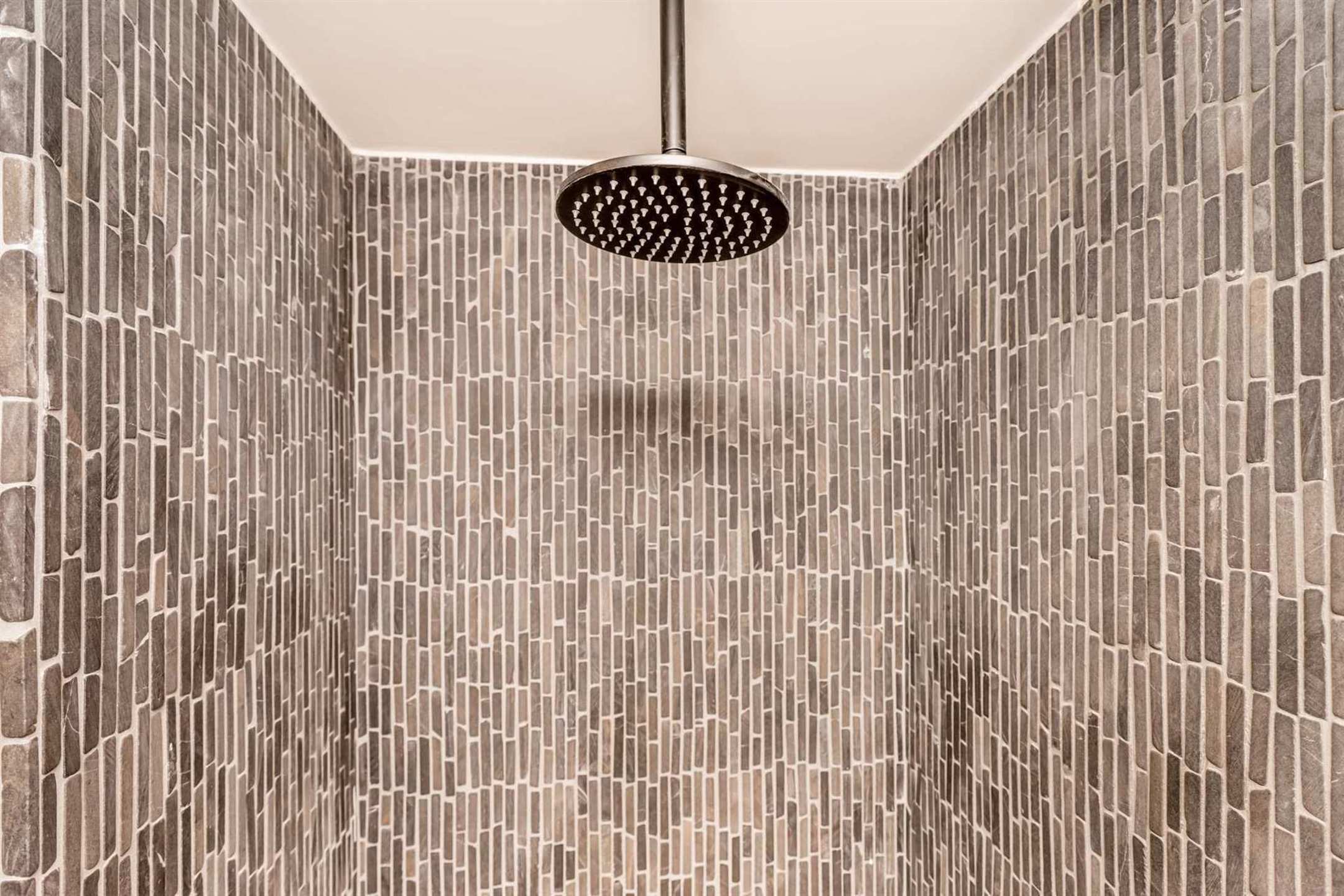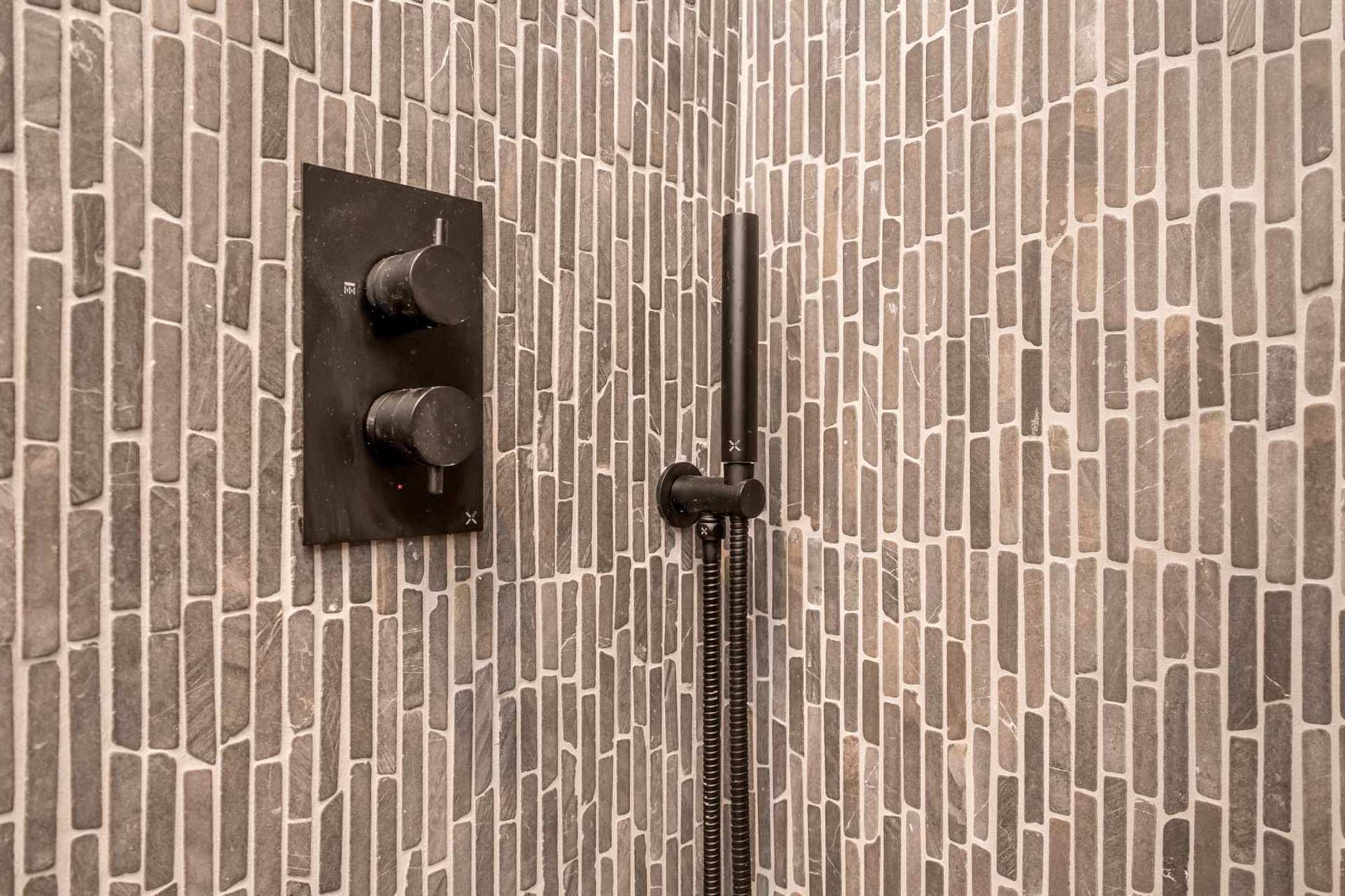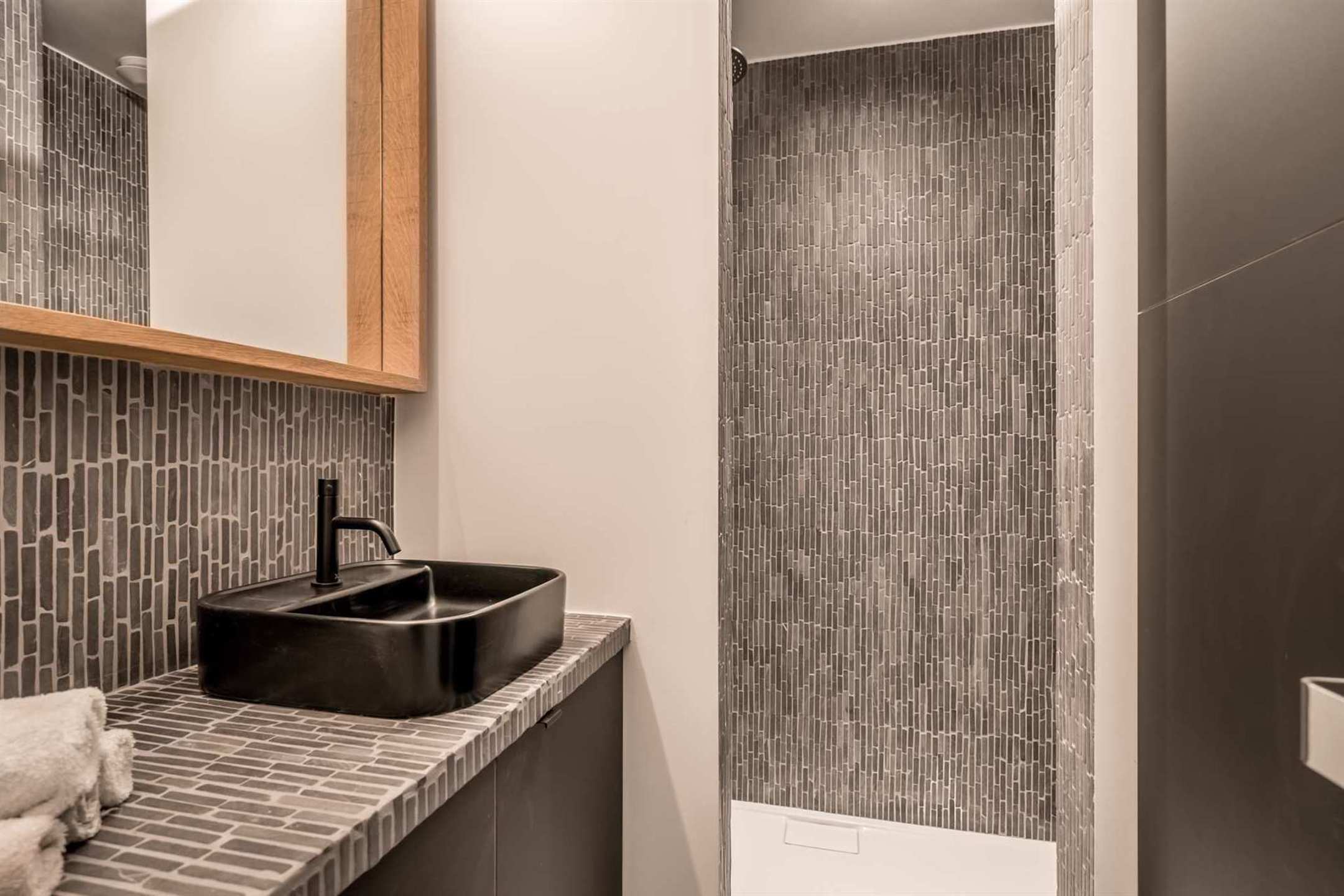 Achteraan bevinden zich de 2 ruime slaapkamers waarbij de masterbedroom meteen toegang geeft tot het terras. De badkamer bestaat uit een inloopdouche met wanden in marmermozaiek, design lavabo & designradiator.