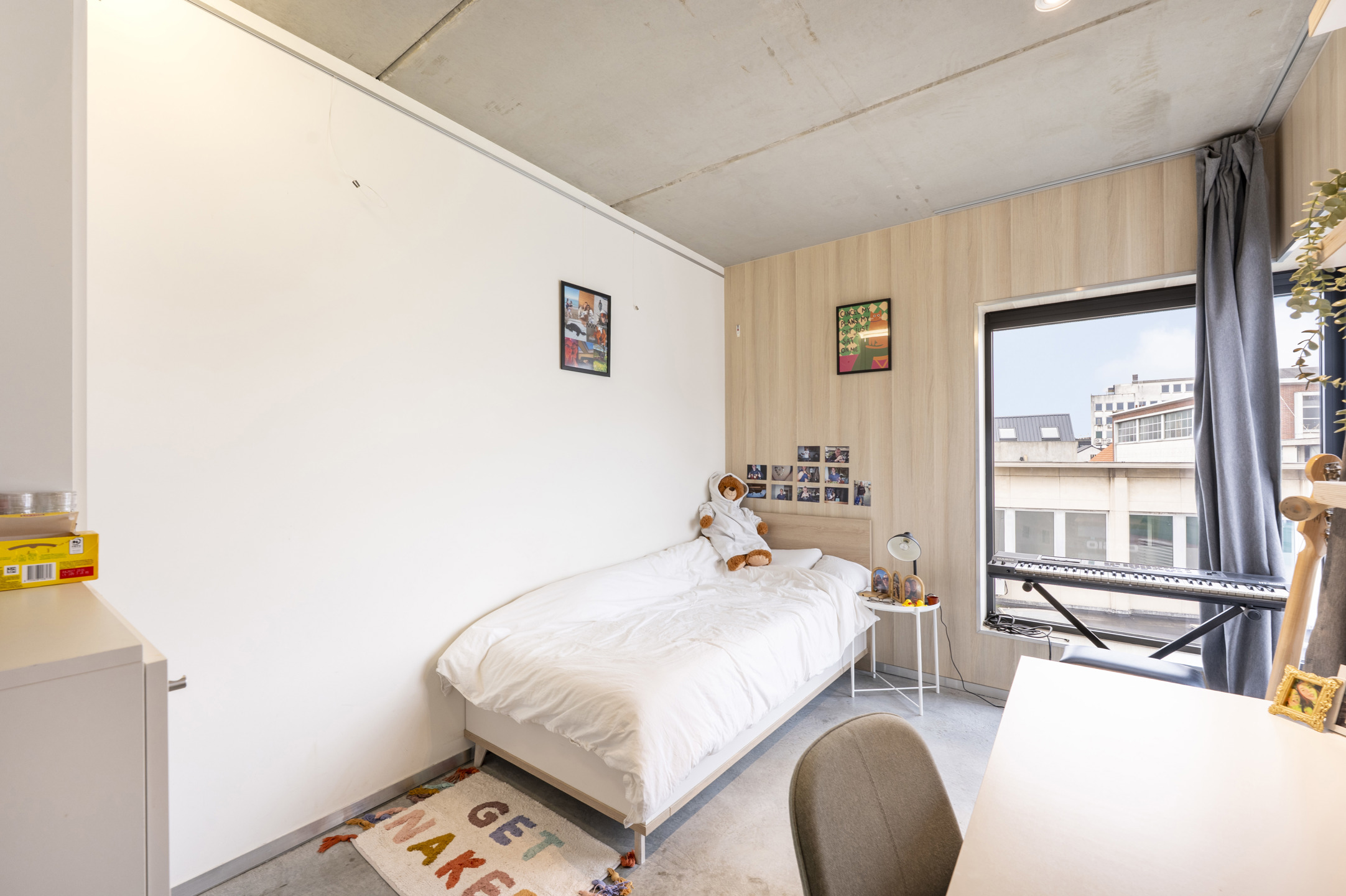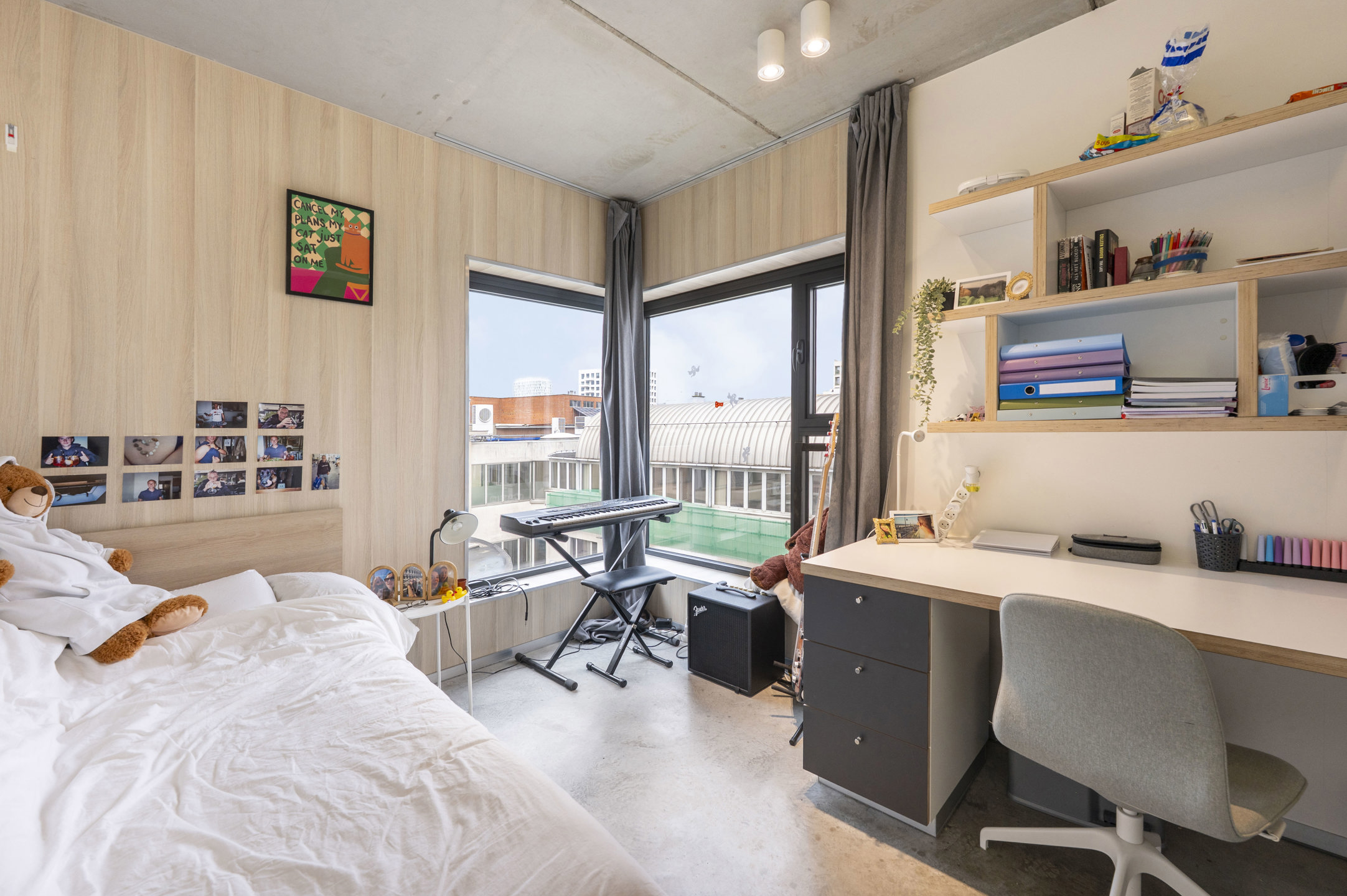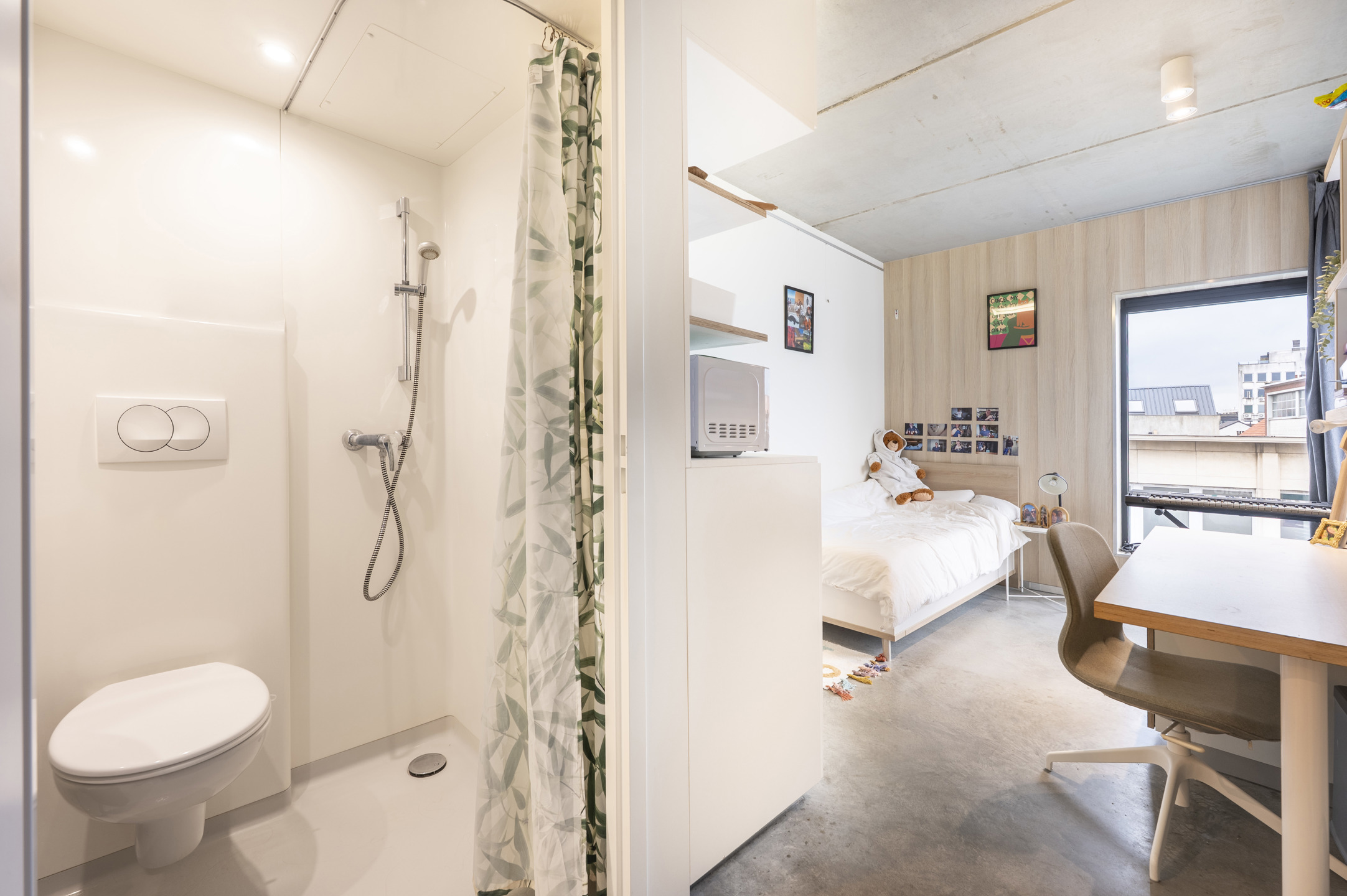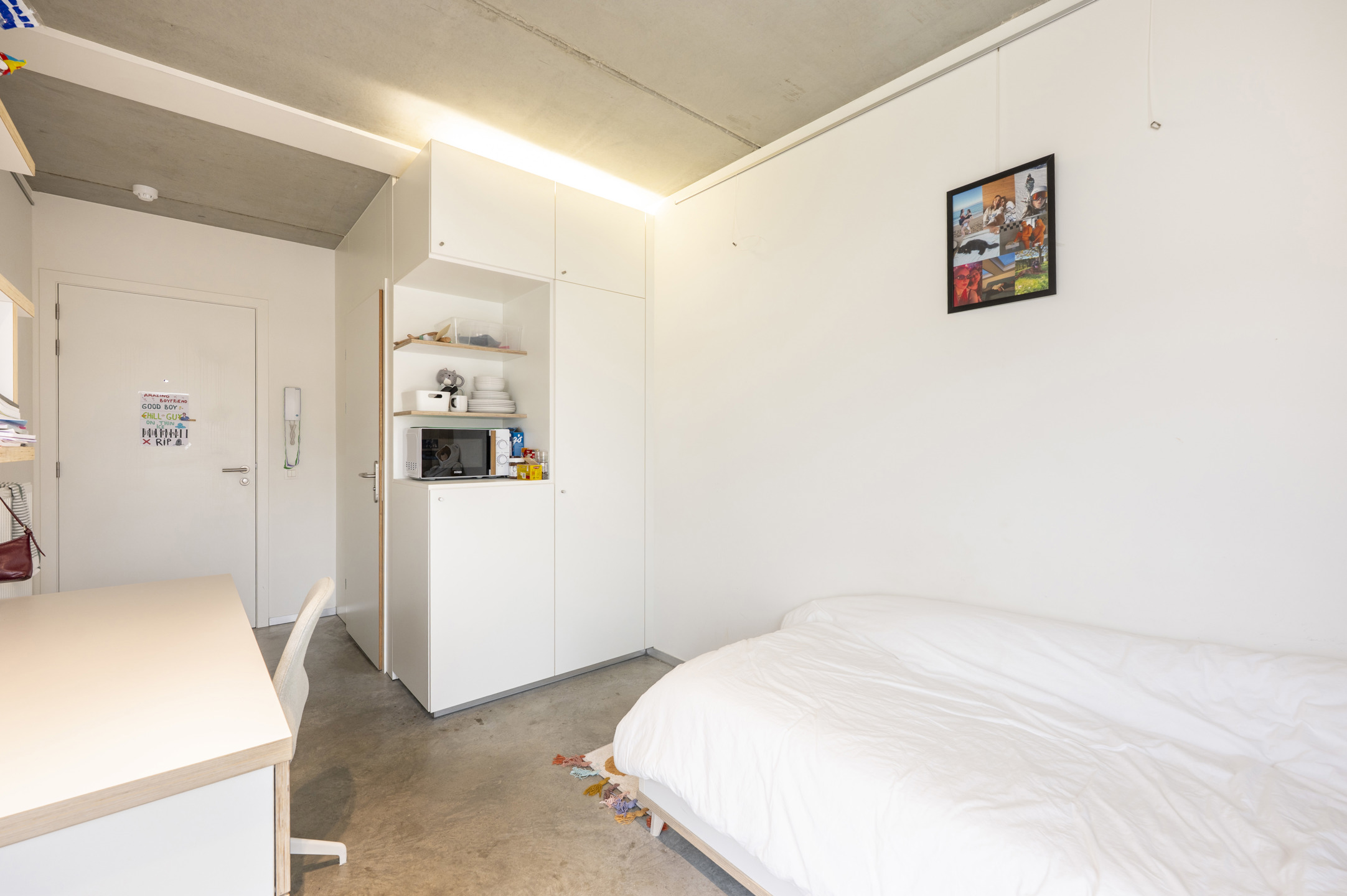 De studentenkamer bevindt zich op het 4de verdiep en omvat een lichtrijke slaap- en studeerruimte met betonnen gietvloer, ingericht met bed, bureau en keukengerief. Aansluitend is er een private badkamer met douche en wc.