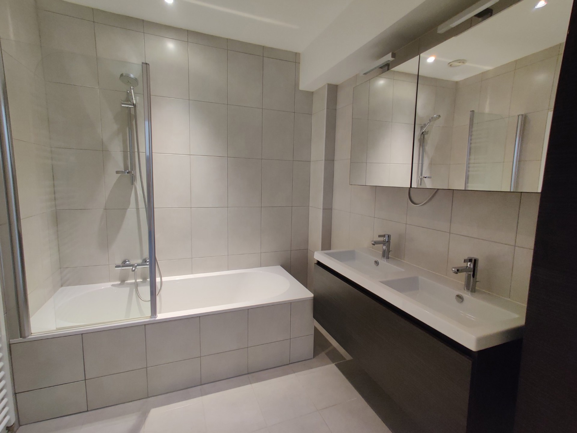 De badkamer is voorzien van een dubbel wastafelmeubel en een luxe ligbad met douchescherm. Daarnaast is er de aansluiting voor een wasmachine en droogkast. Het gastentoilet is apart.