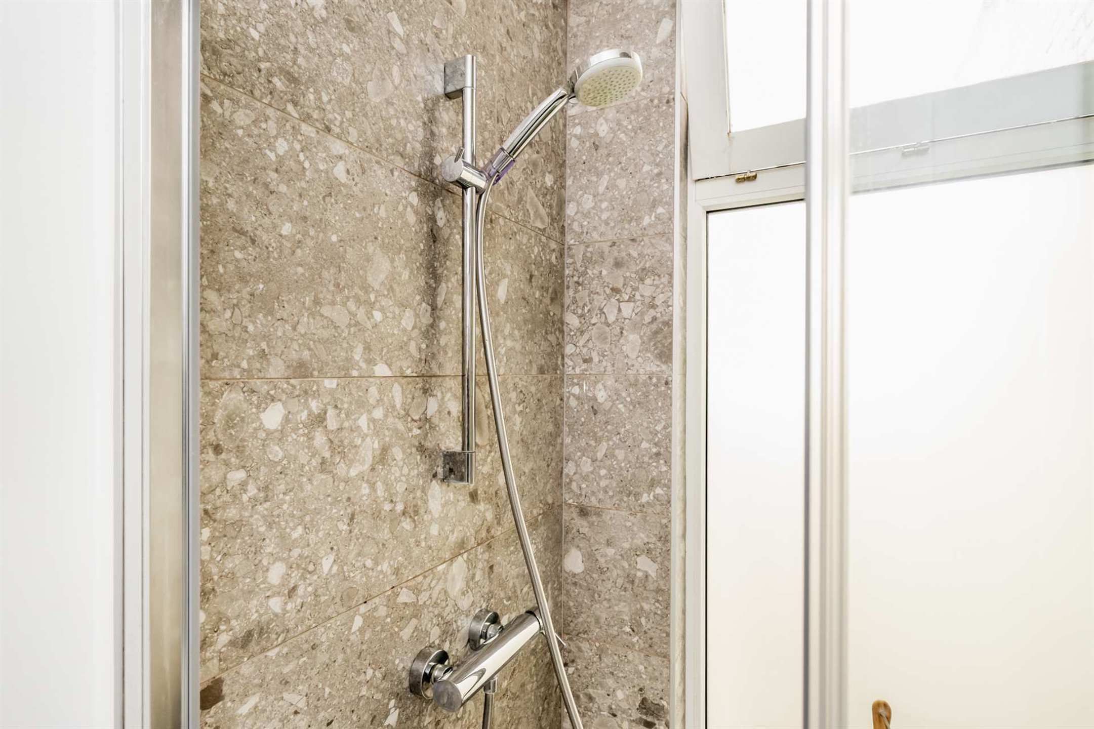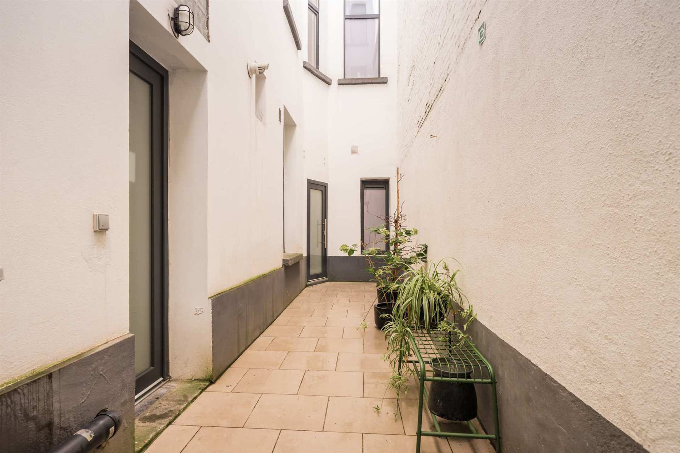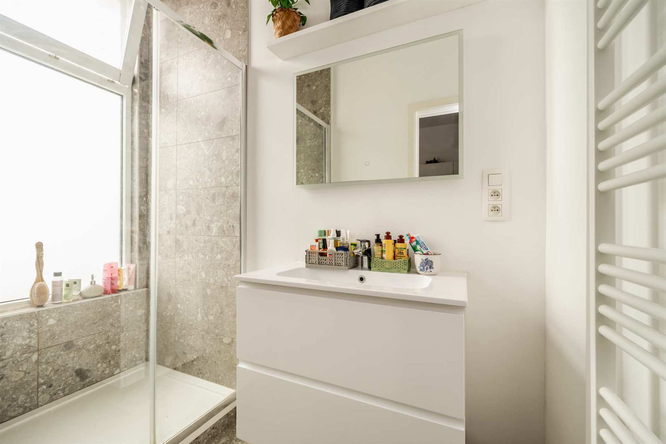 Vanuit hier heeft u toegang tot de moderne badkamer en twee slaapkamers, waarvan één momenteel is ingericht als bureau en dressing. De badkamer is prachtig afgewerkt met grijsbruine natuurstenen tegels, een ruime inloopdouche, een grote lavabo met meubel en spiegel.