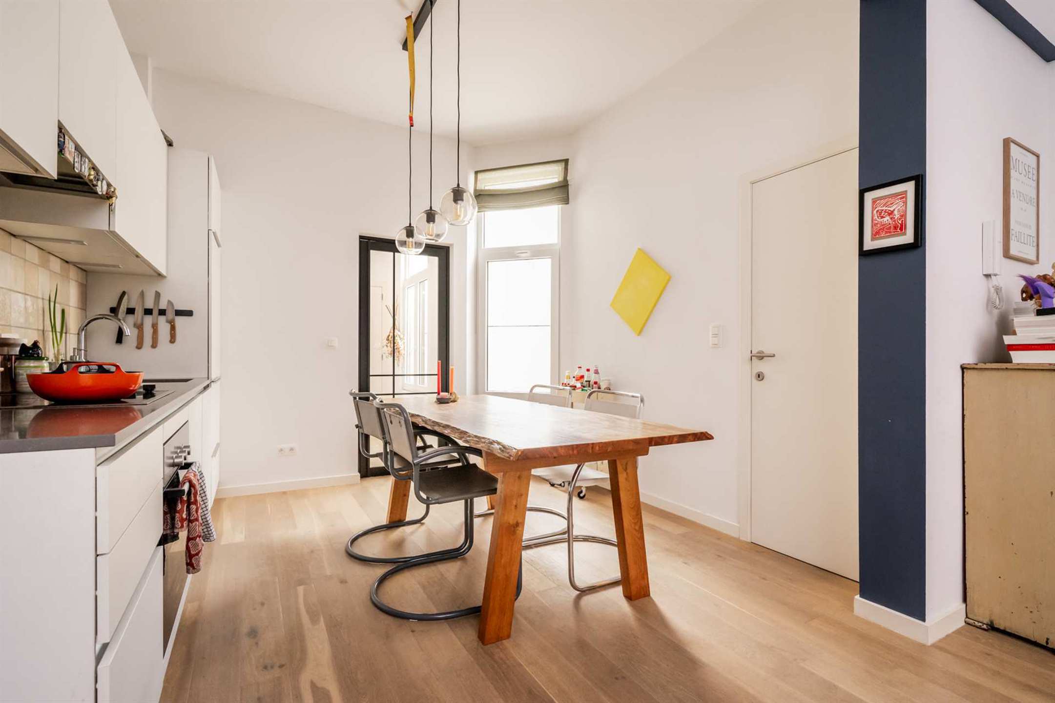 Men betreedt het appartement via de mooie inkomhal met handige vestiaire en een aparte wc. Via de moderne stalen deur komen we in de open keuken, die naadloos overloopt in de leefruimte. De overvloedige lichtinval en de prachtige doorlopende parketvloer vallen meteen op. De strakke witte keuken is uitgerust met een onderhoudsvriendelijk grijs composietblad en hoogwaardige toestellen, waaronder een elektrisch fornuis, een ingewerkte dampkap, een spoelbak, een koelkast met vriesvak, een oven en zelfs een vaatwasser.