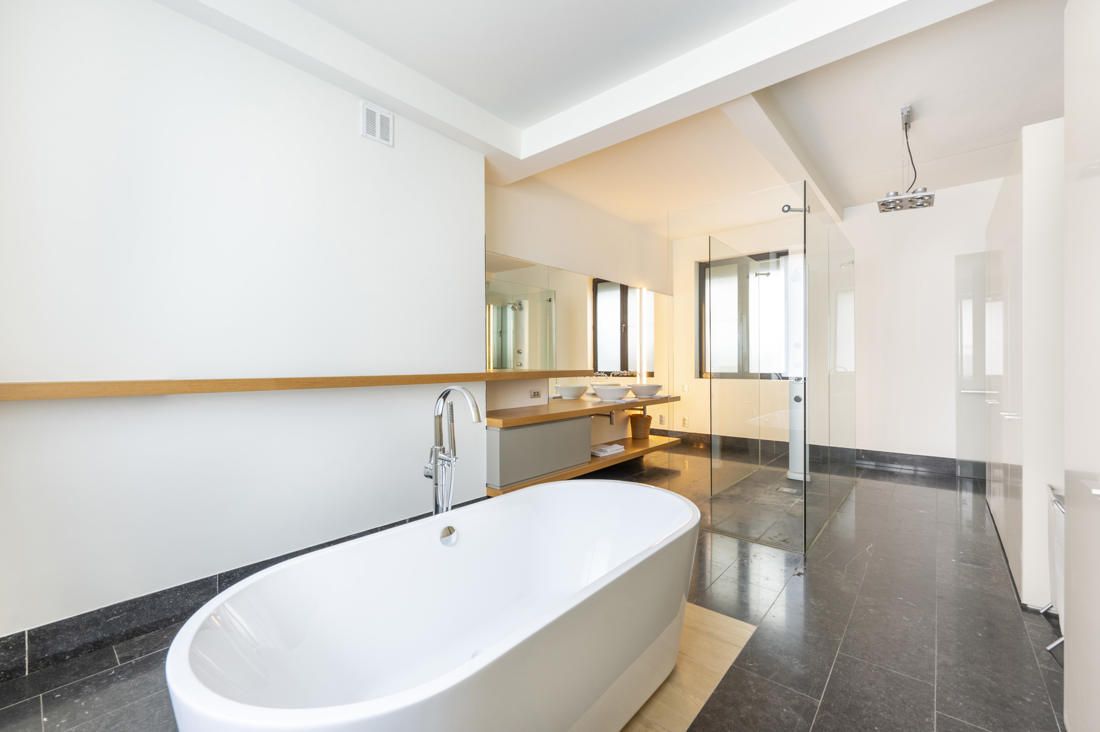 De loft biedt momenteel twee royale slaapkamers, maar er is voldoende ruimte om eenvoudig twee extra slaapkamers te creëren. De masterbedroom beschikt over een volledig ingemaakte dressing en een ensuite badkamer met dubbele lavabo, een ligbad, een grote inloopdouche en ingemaakte kasten. Daarnaast is er een tweede badkamer voorzien van douche, lavabo en aansluitingen voor was- en droogmachine. Extra bergruimte maakt het geheel compleet.