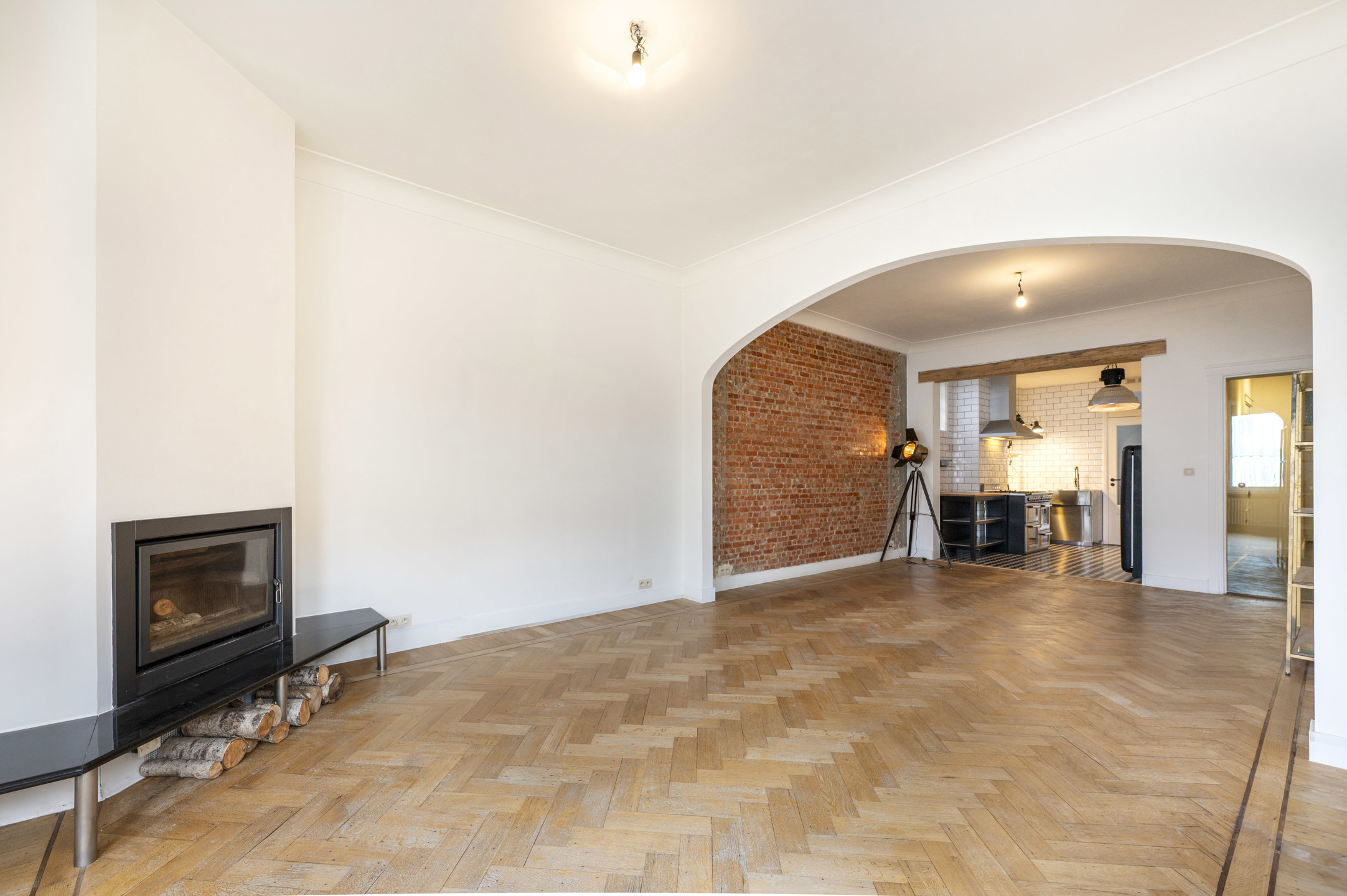 De leefruimte is voorzien van een originele parketvloer in visgraatmotief en wordt mooi verlicht door de grote ramen. De charmante arcade voegt extra karakter toe, terwijl de rode stenen wand een industriële uitstraling geeft. De open haard zorgt voor een gezellige sfeer in de wintermaanden.