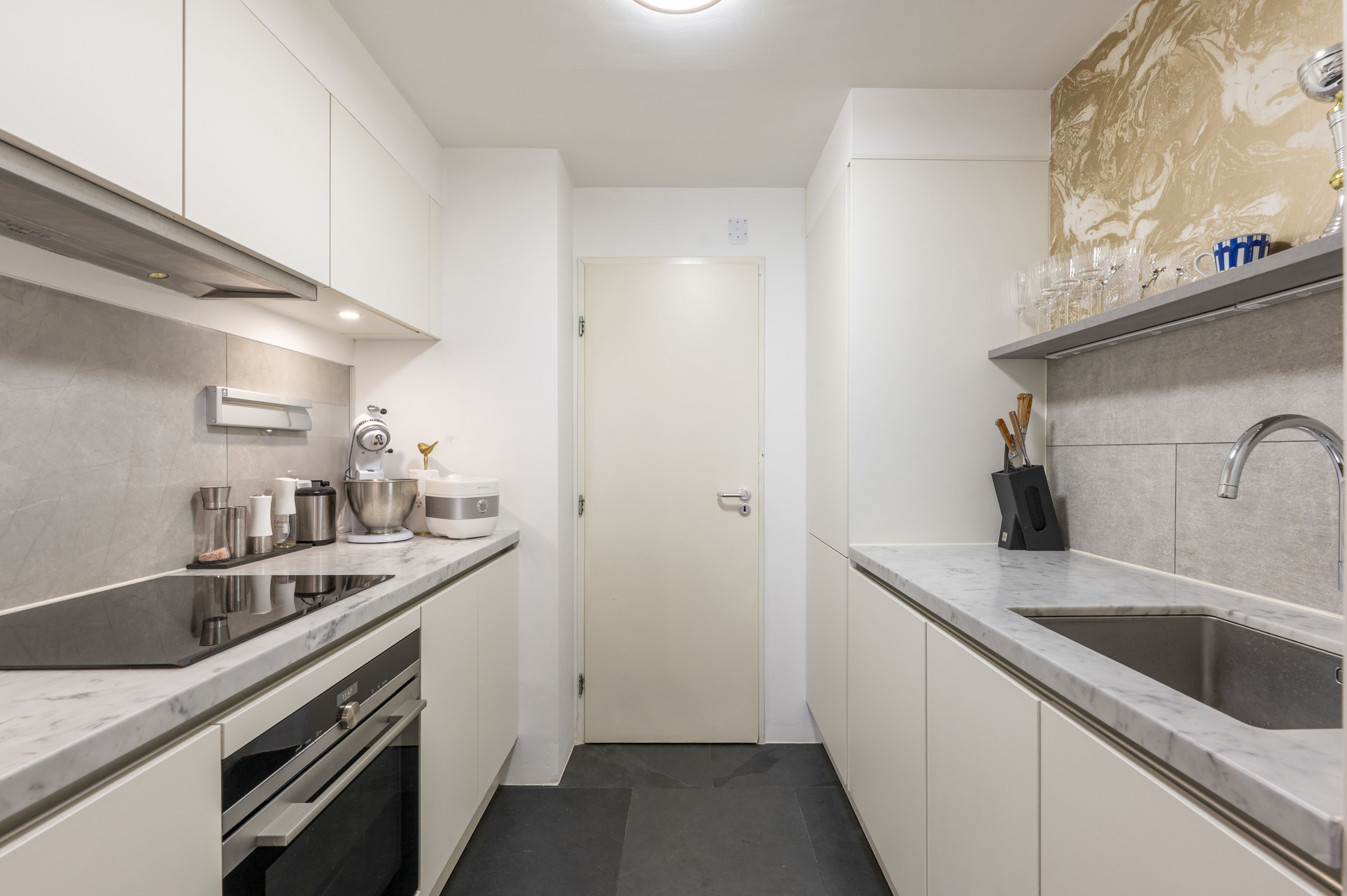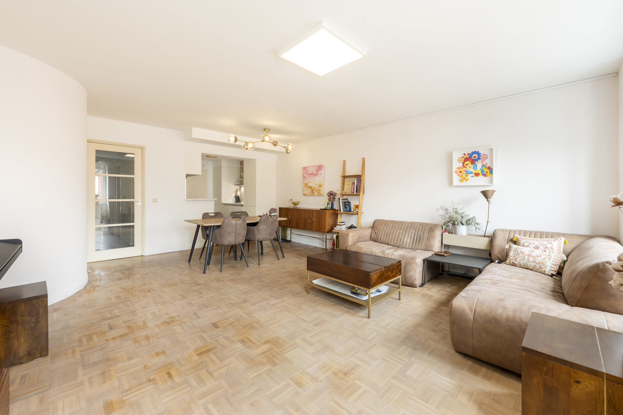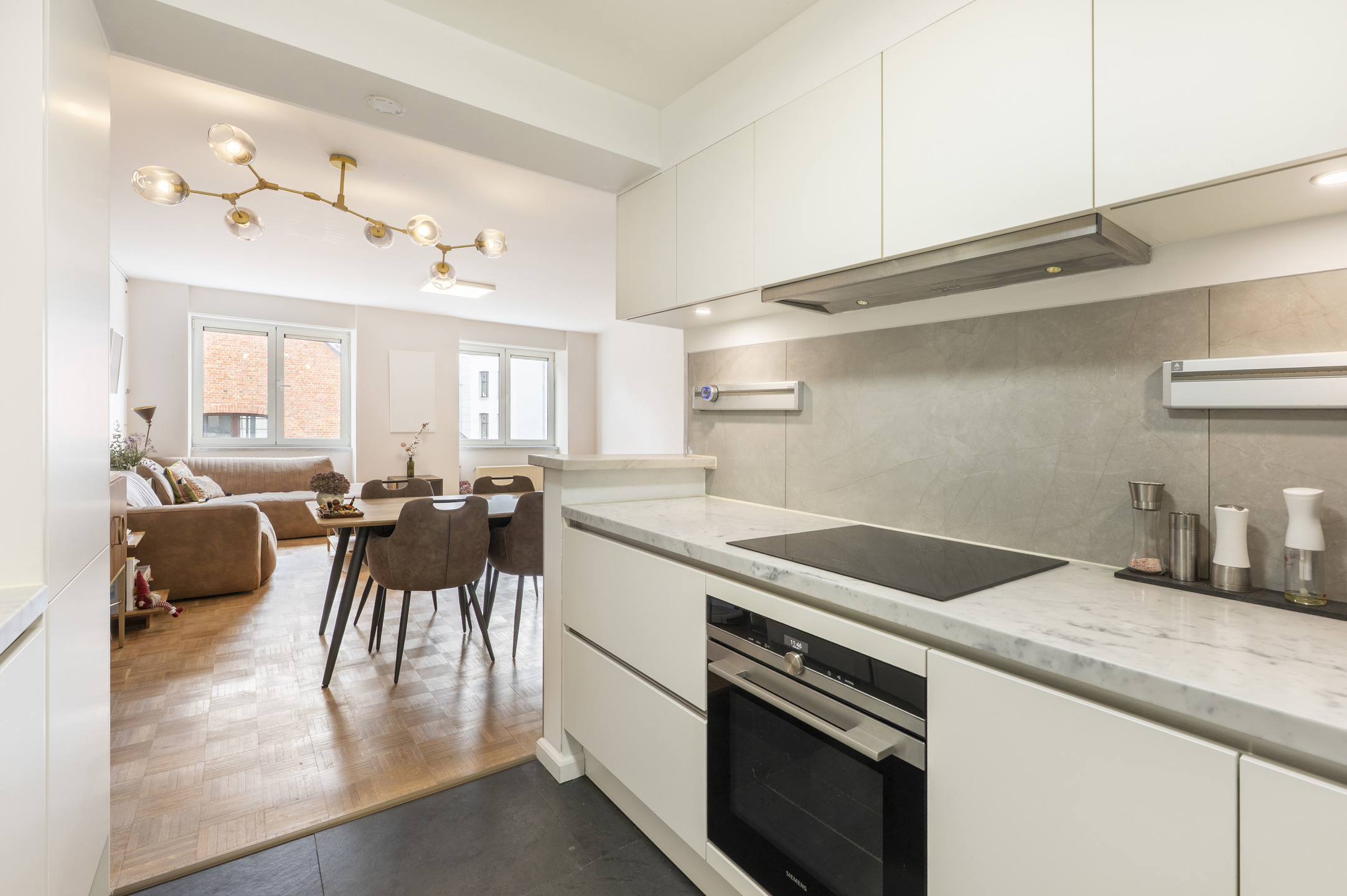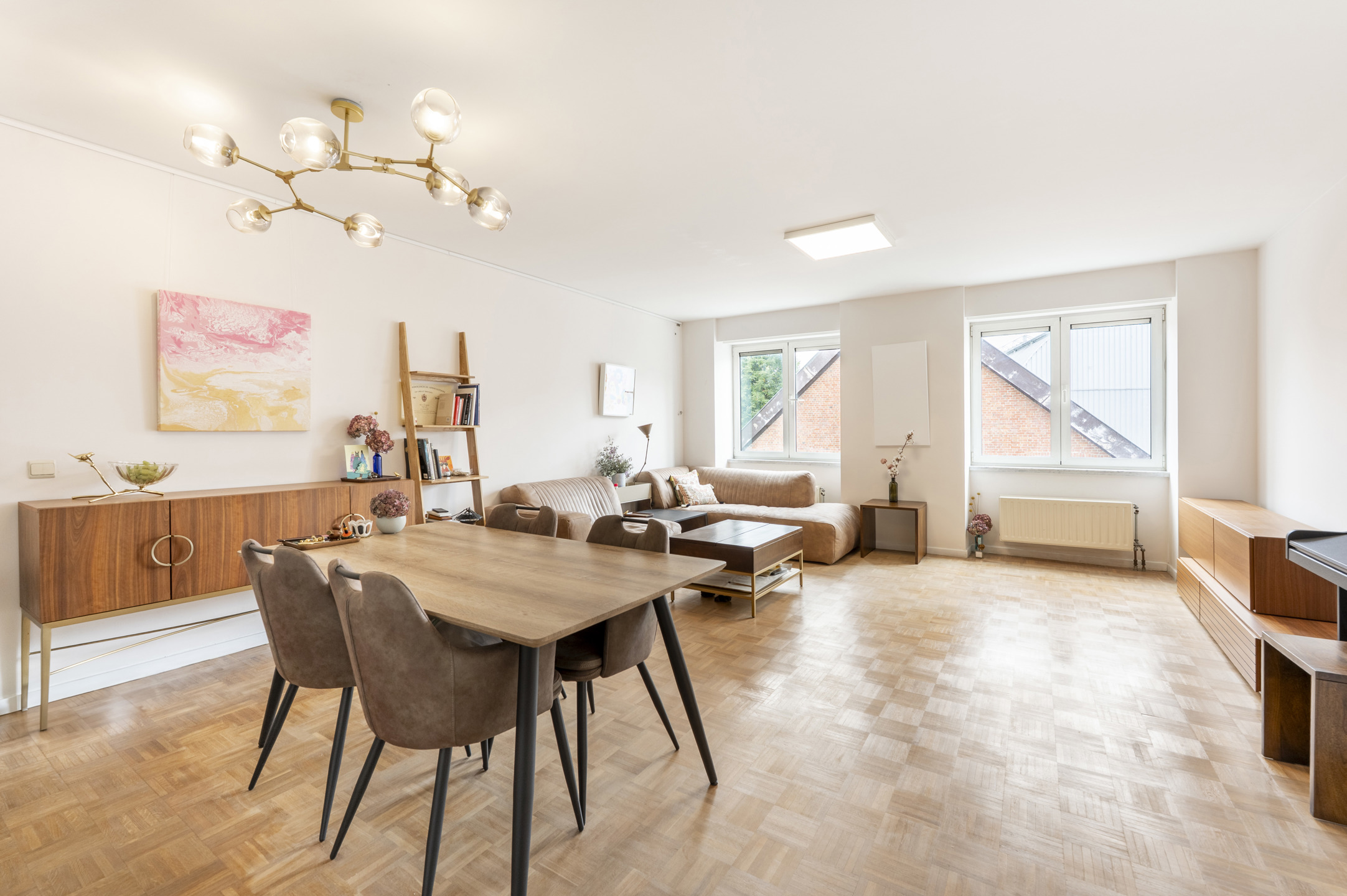 Bij binnenkomst via de inkomhal kom je in de ruime, lichtrijke living met prachtige blokjesparket. Er is voldoende plaats voor een eettafel en zithoek, en de halfopen, volledig gerenoveerde keuken sluit hier naadloos op aan. De keuken is uitgerust met alle moderne toestellen en heeft een handige aparte bergruimte.