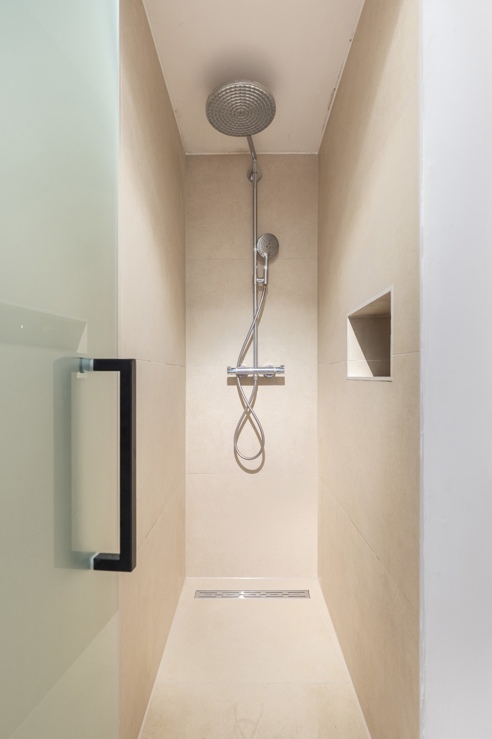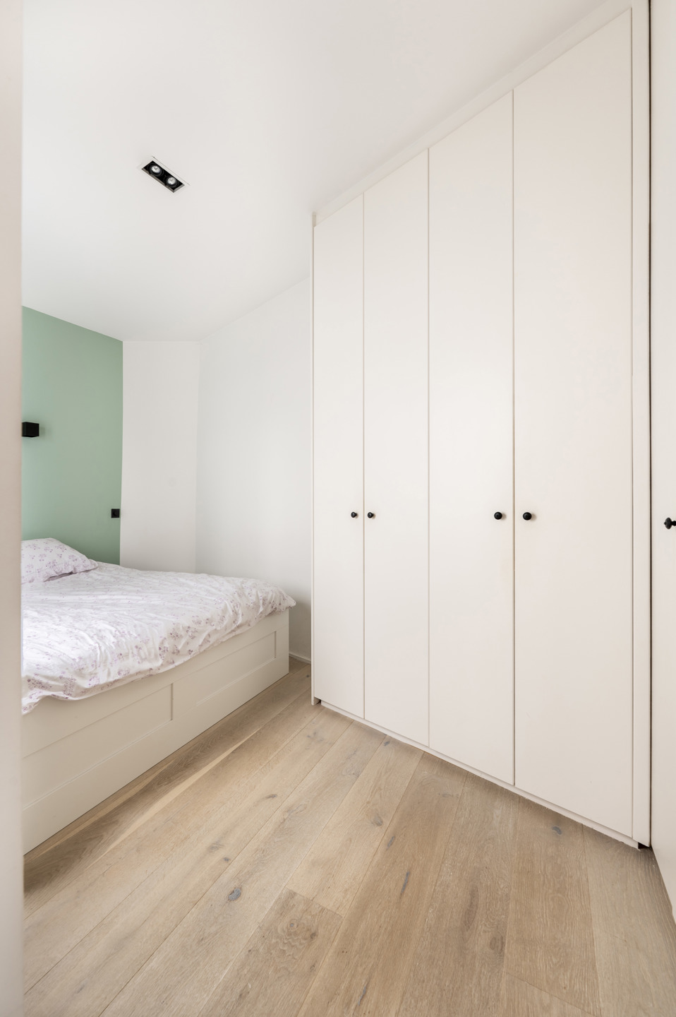 Een kleine trap leidt naar de ruime slaapkamer, voorzien van veel ingemaakte kasten – ideaal als dressing. Aansluitend vind je een praktische wasplaats met plaats voor was- en droogmachine, netjes weggewerkt in kasten. De moderne badkamer beschikt over een inloopdouche, lavabo in meubel en toilet.
