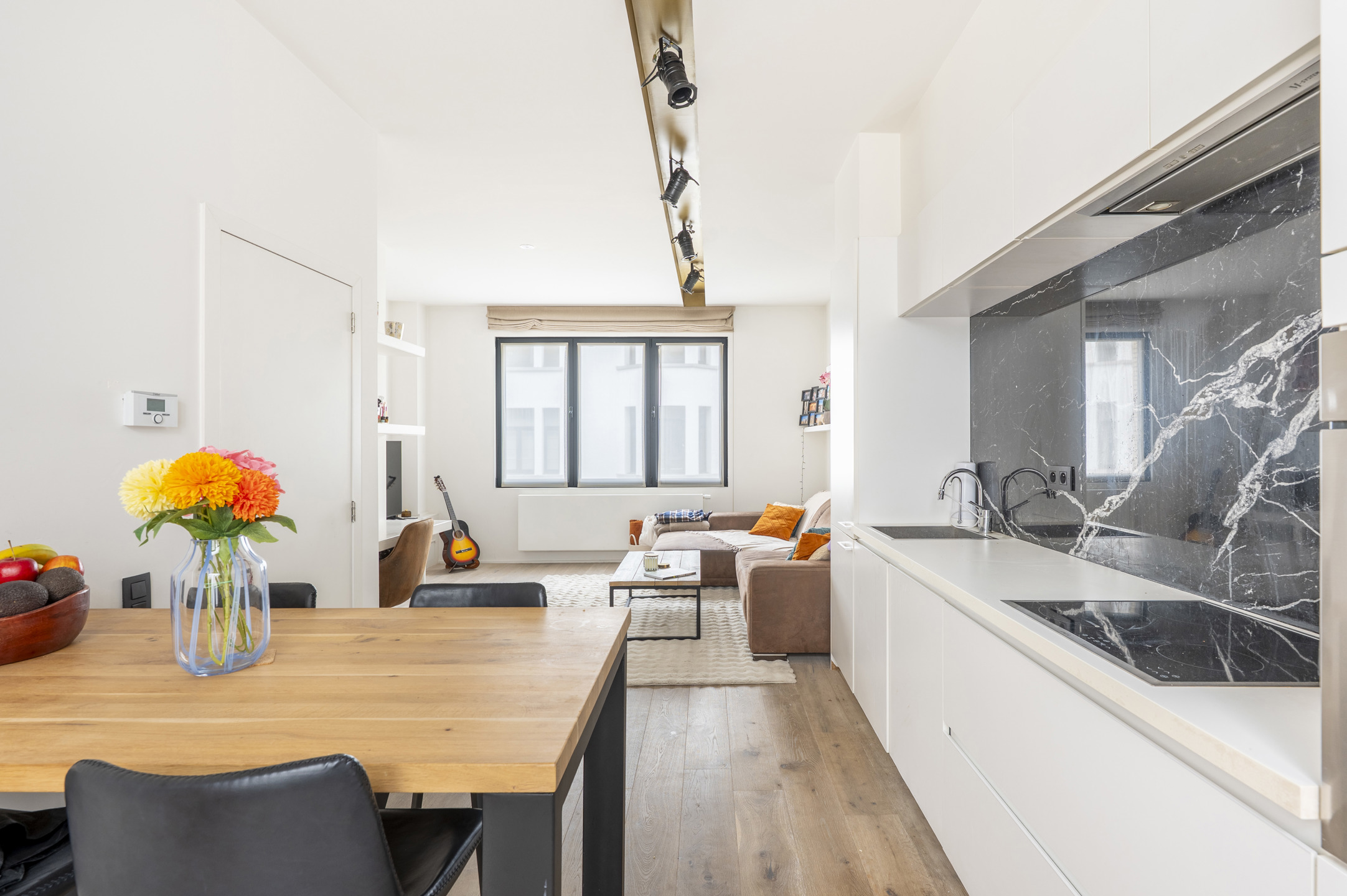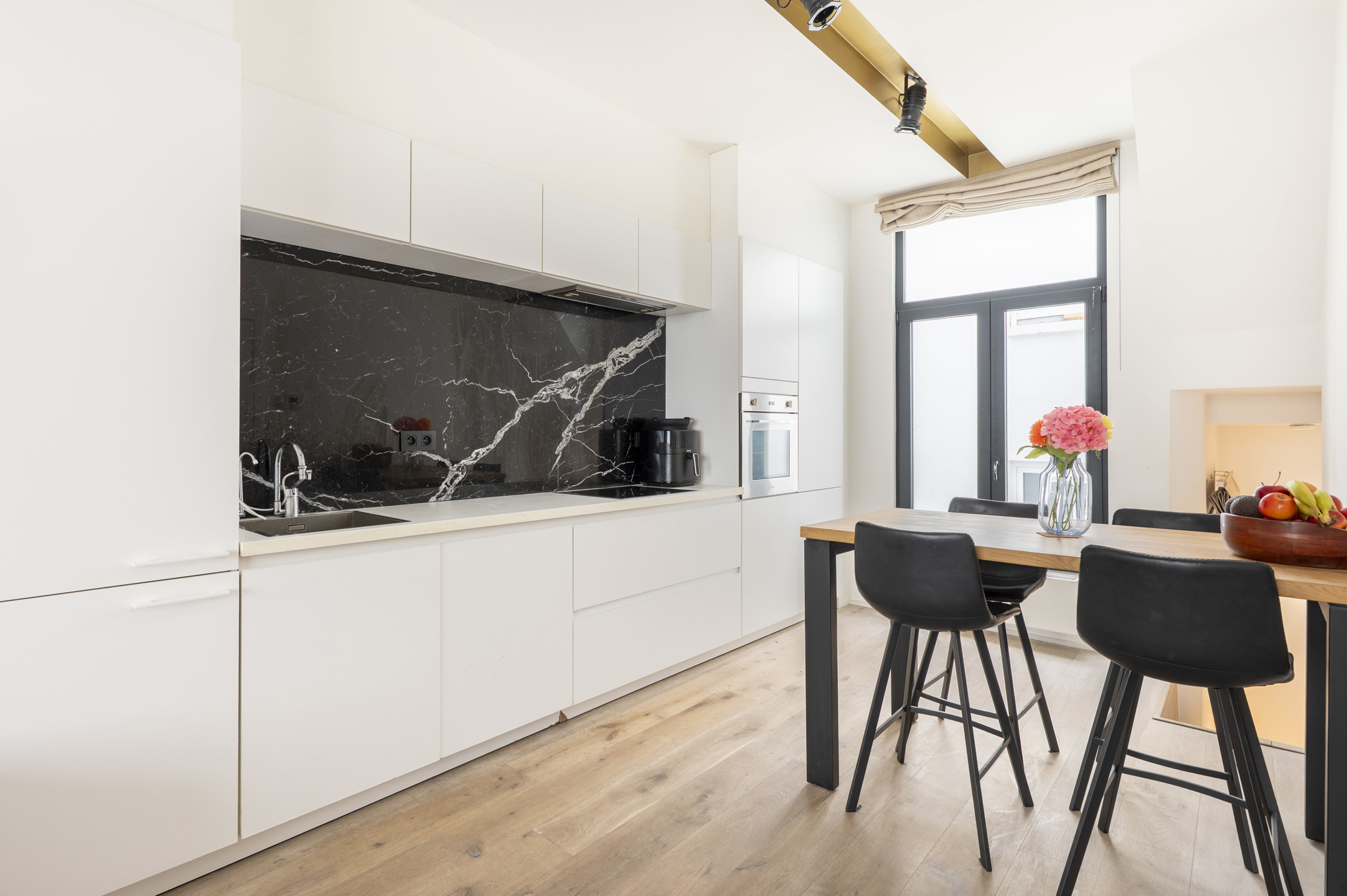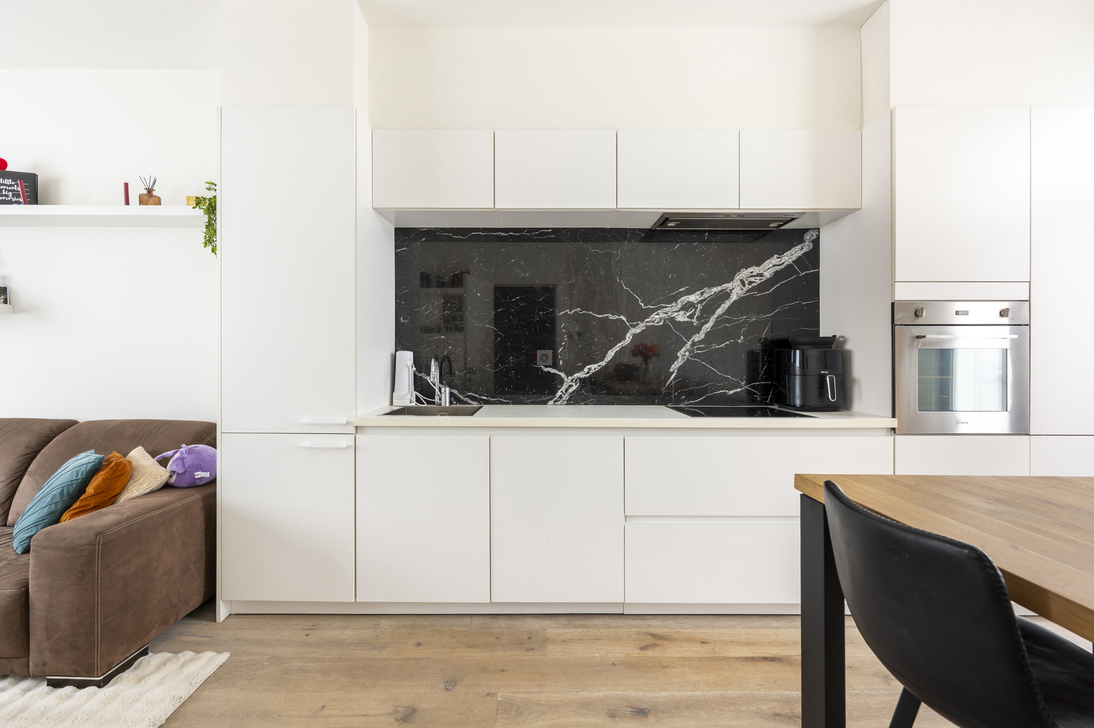 De open keuken werd met oog voor detail afgewerkt en is uitgerust met alle moderne toestellen. Er is bovendien ruimte voorzien voor een eettafel of gezellige ontbijthoek.