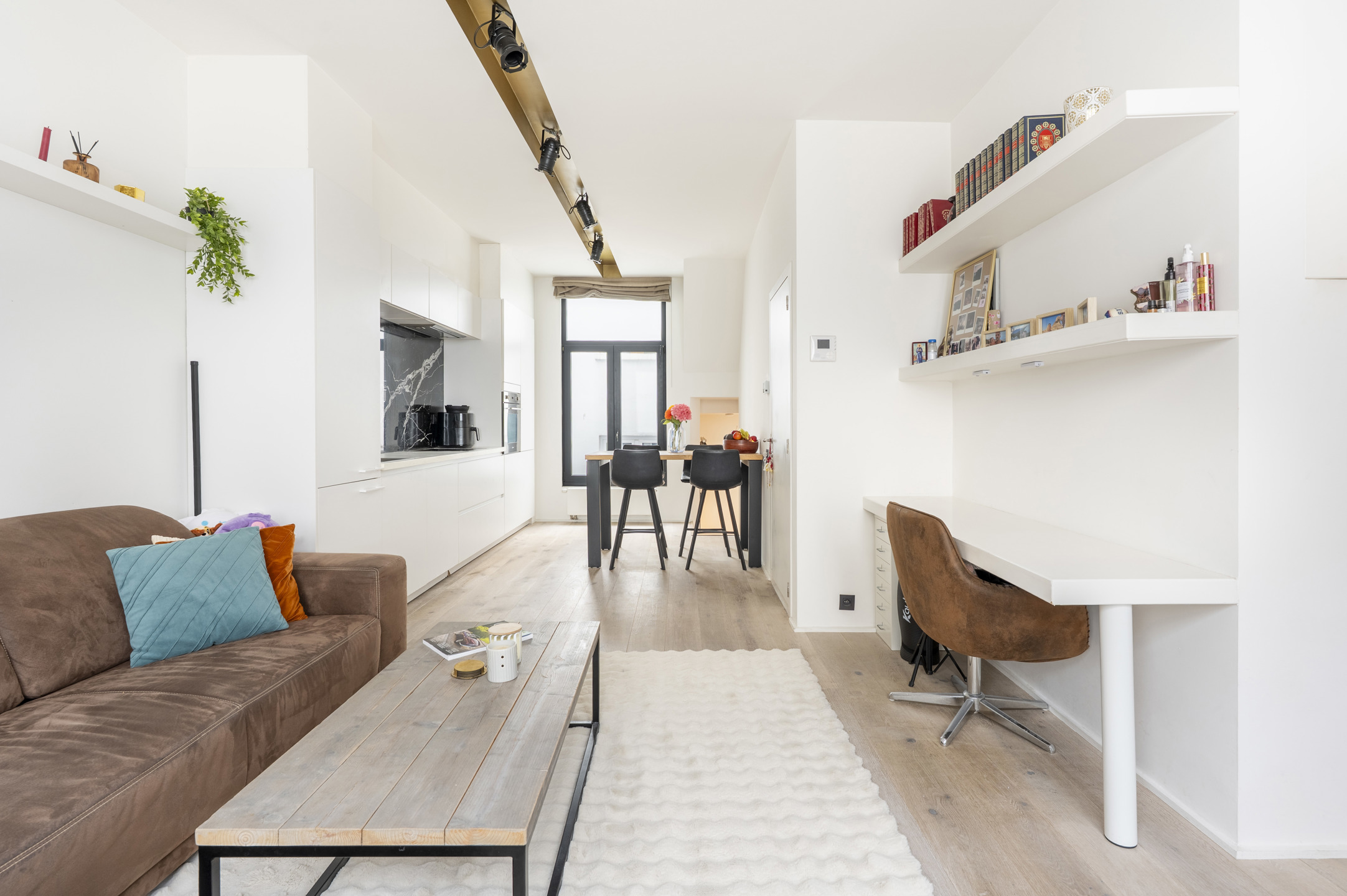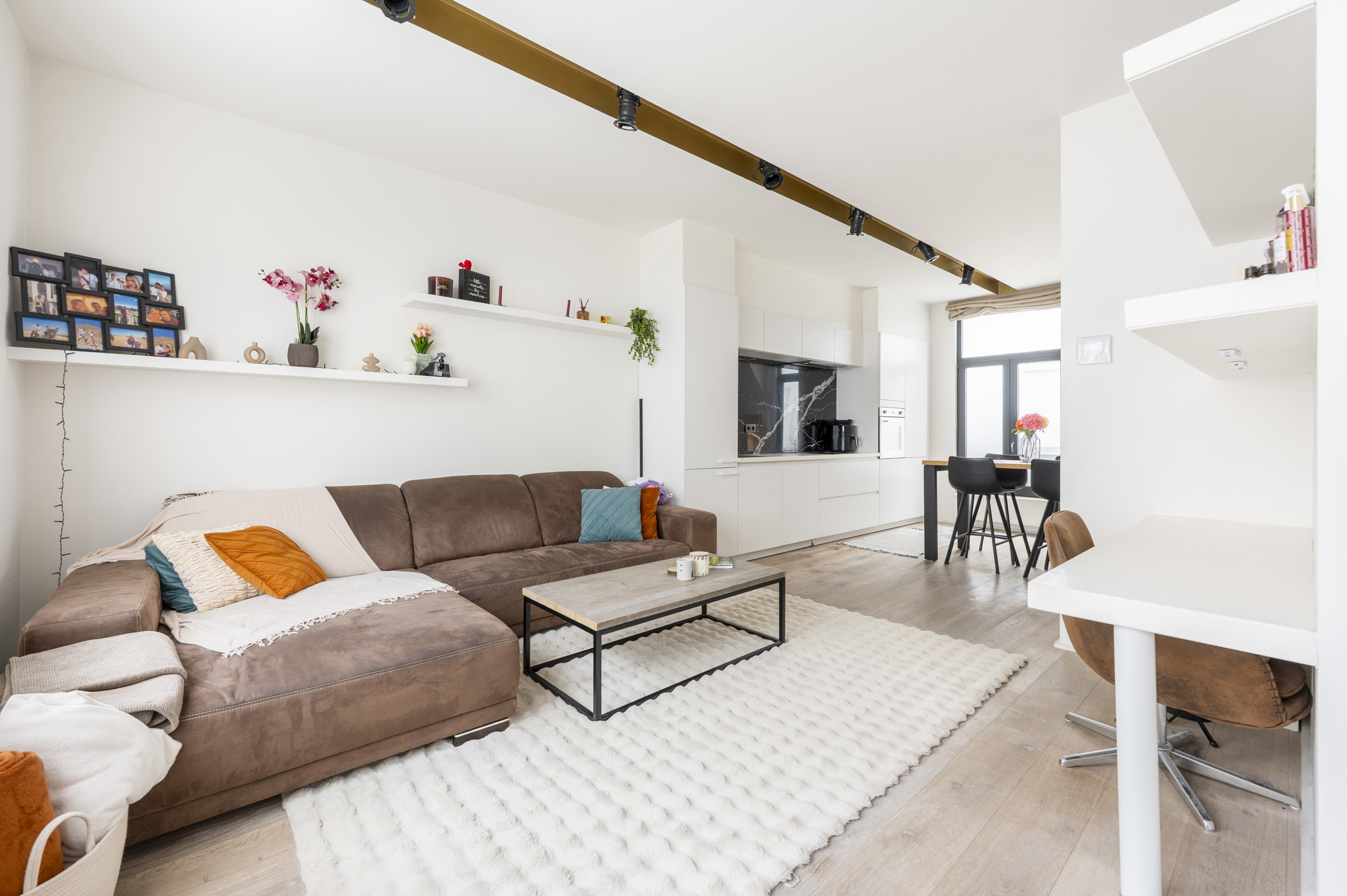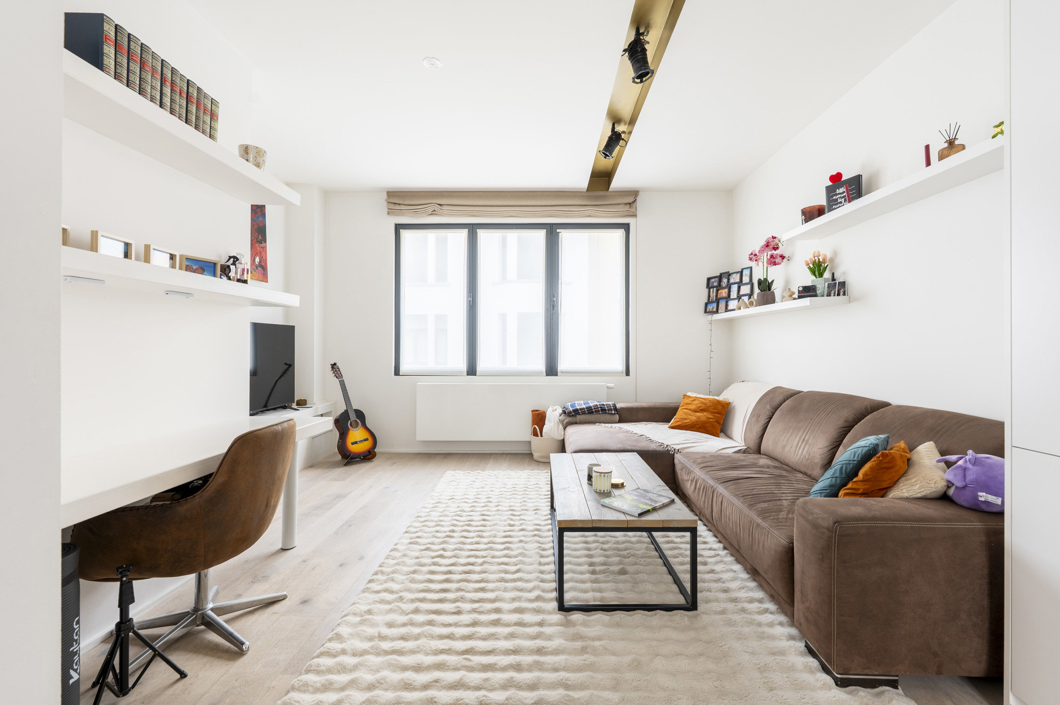 Bij het binnenkomen word je verwelkomd door een lichte, ruime leefruimte met mooie parketvloer en maatwerkmeubilair (ingemaakte bureau, tv-meubel en schappen). Het vormt een warm en doordacht ingericht geheel.