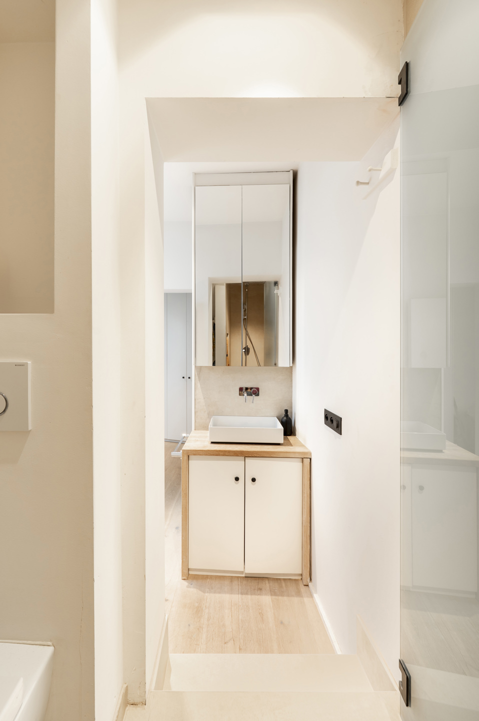 Het appartement bevindt zich op de eerste verdieping van een zeer kleinschalig gebouw met uiterst lage gemeenschappelijke kosten. Toegang via de trap brengt je eerst naar een ingemaakte vestiaire, perfect voor jassen en schoenen.
