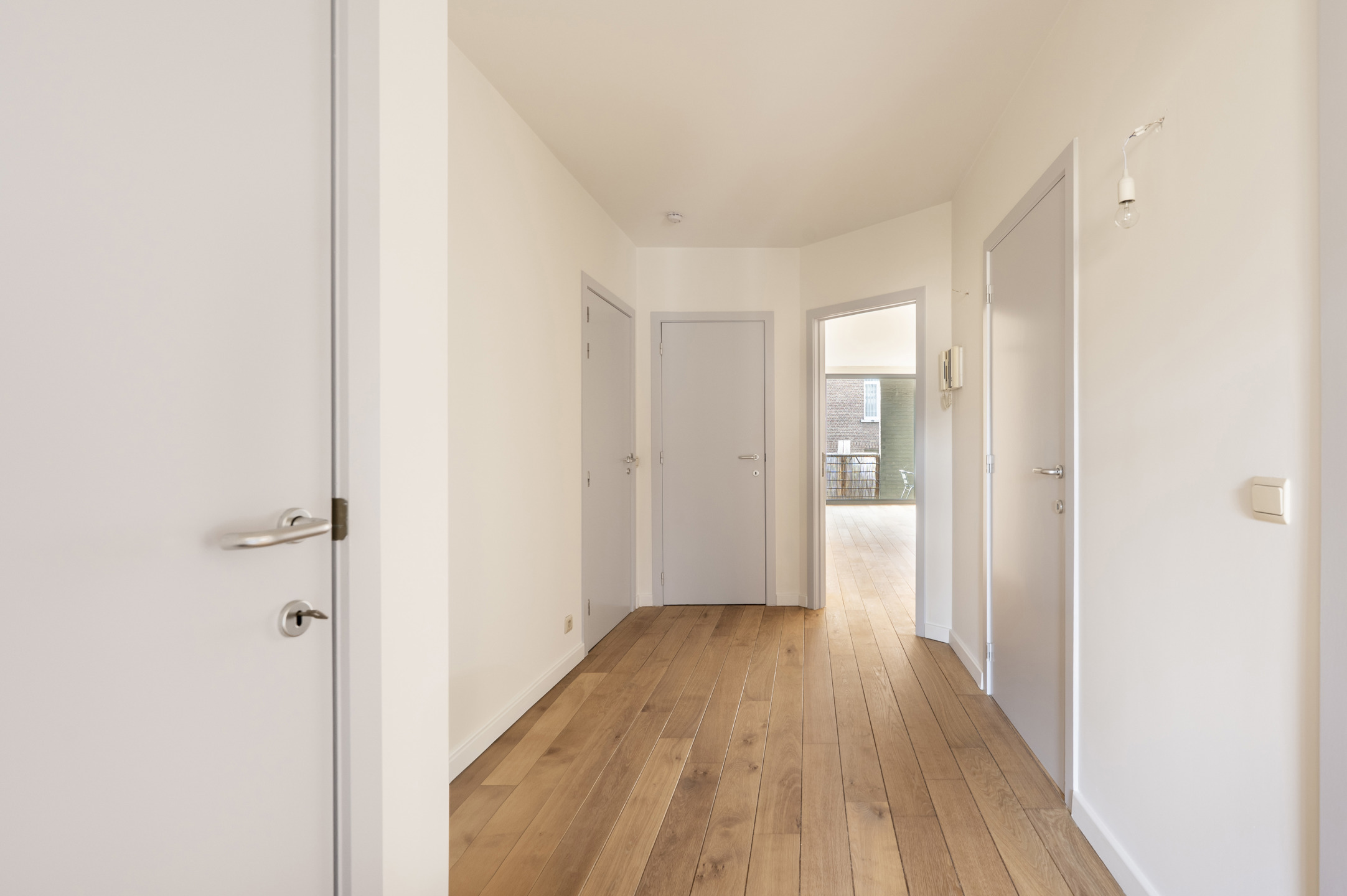 De ruime inkomhal biedt een aangename binnenkomst en is ideaal om een vestiairekast te voorzien. De open, volledig uitgeruste keuken sluit aan op een berging met aansluiting voor wasmachine en droogkast. Verder is er nog een extra berging in het appartement en een private kelderberging.