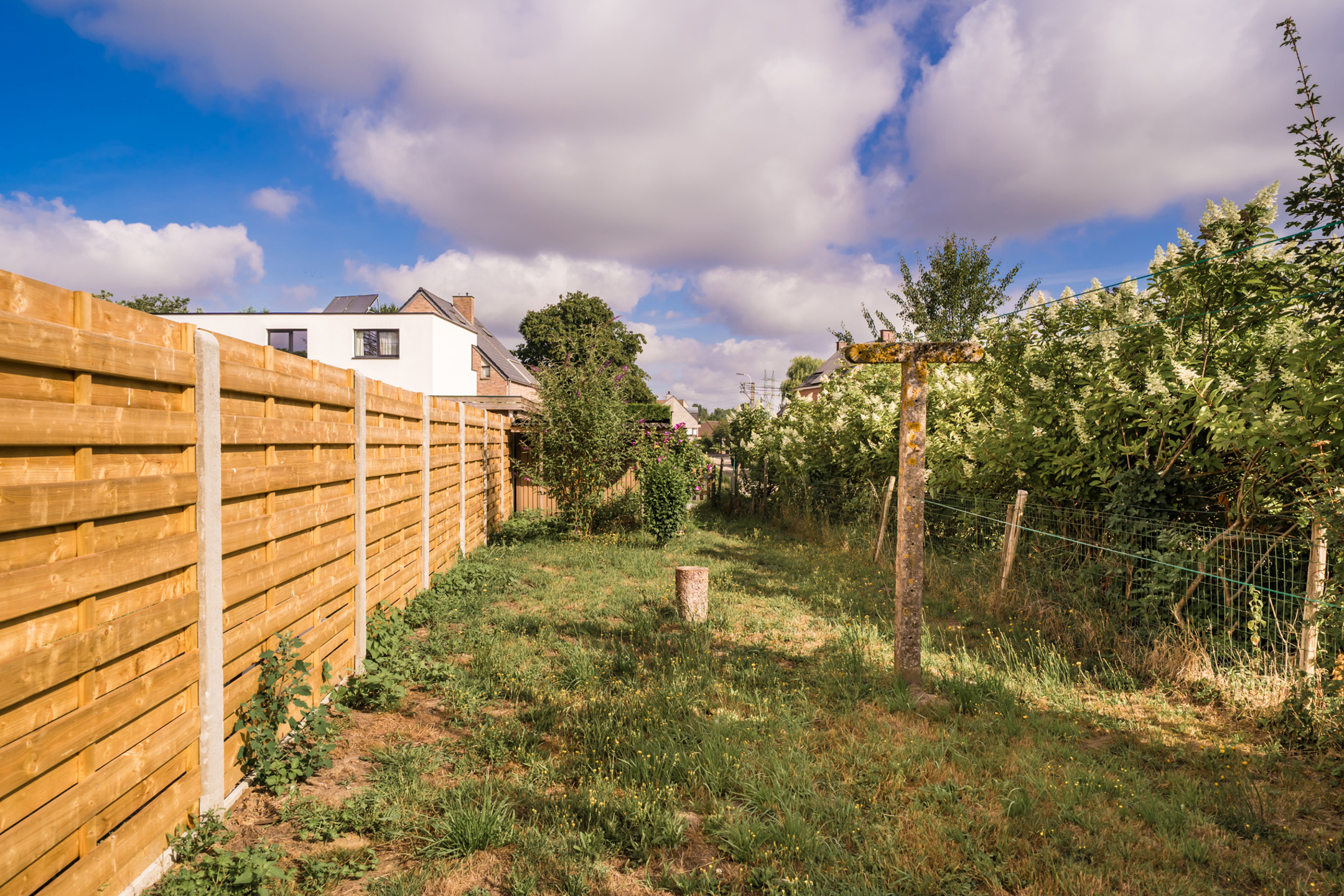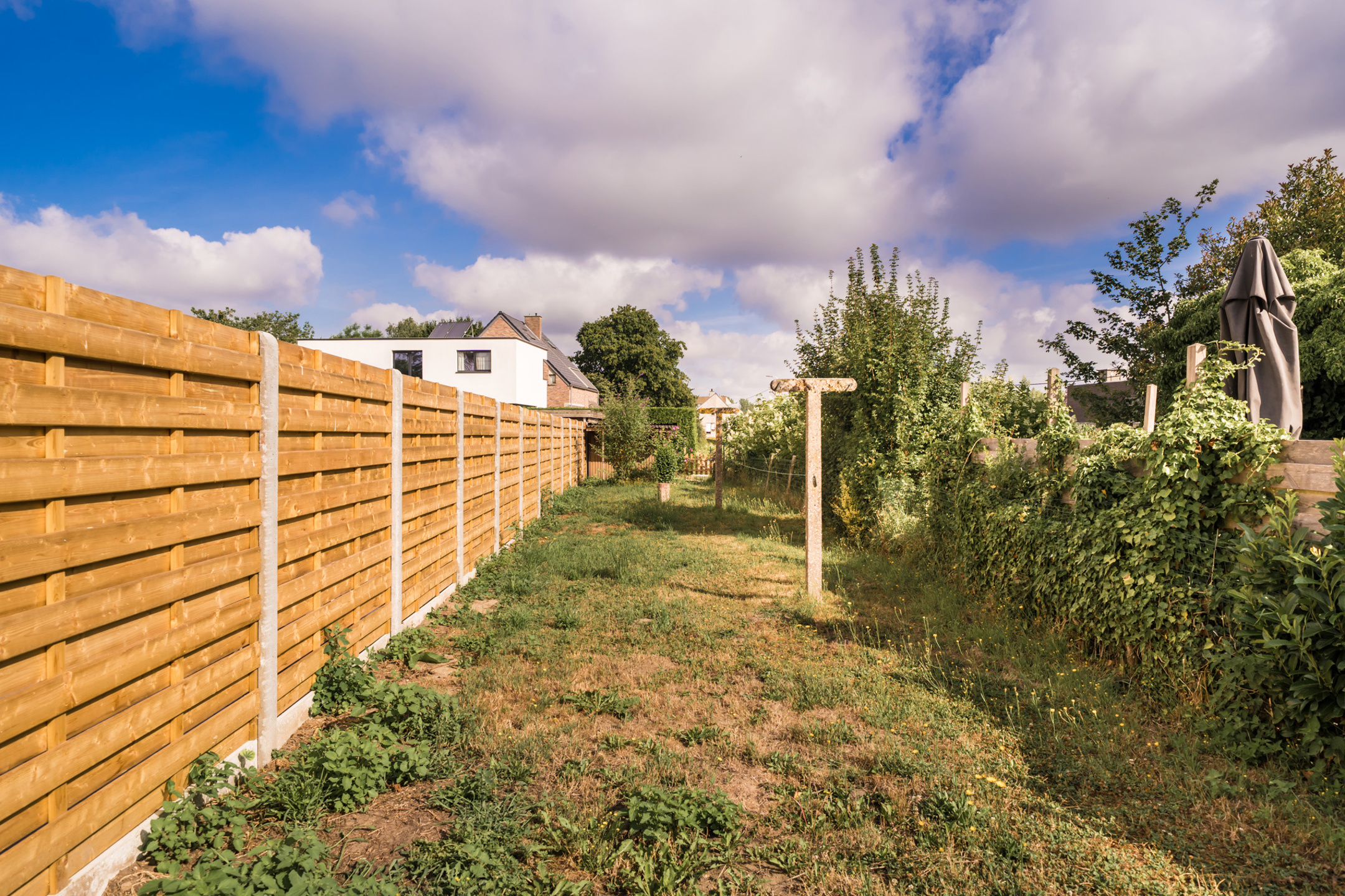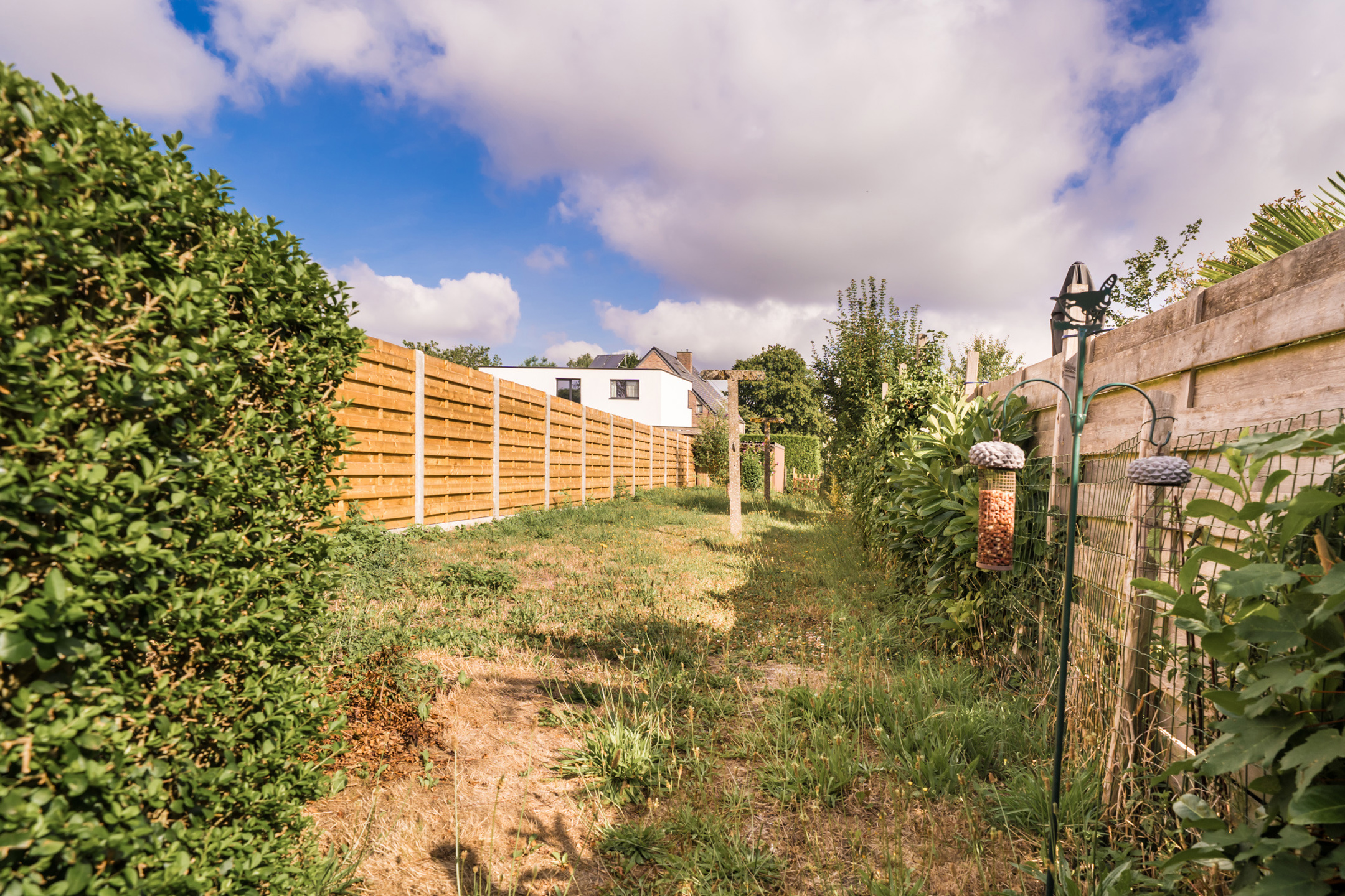 Achteraan de woning bevindt zich een ruim terras. De volledige tuin heeft gras en geeft toegang naar de achteraan gelegen garagebox. De achteruitgang is ideaal voor toegang met de wagen maar ook voor stallen van fietsen.