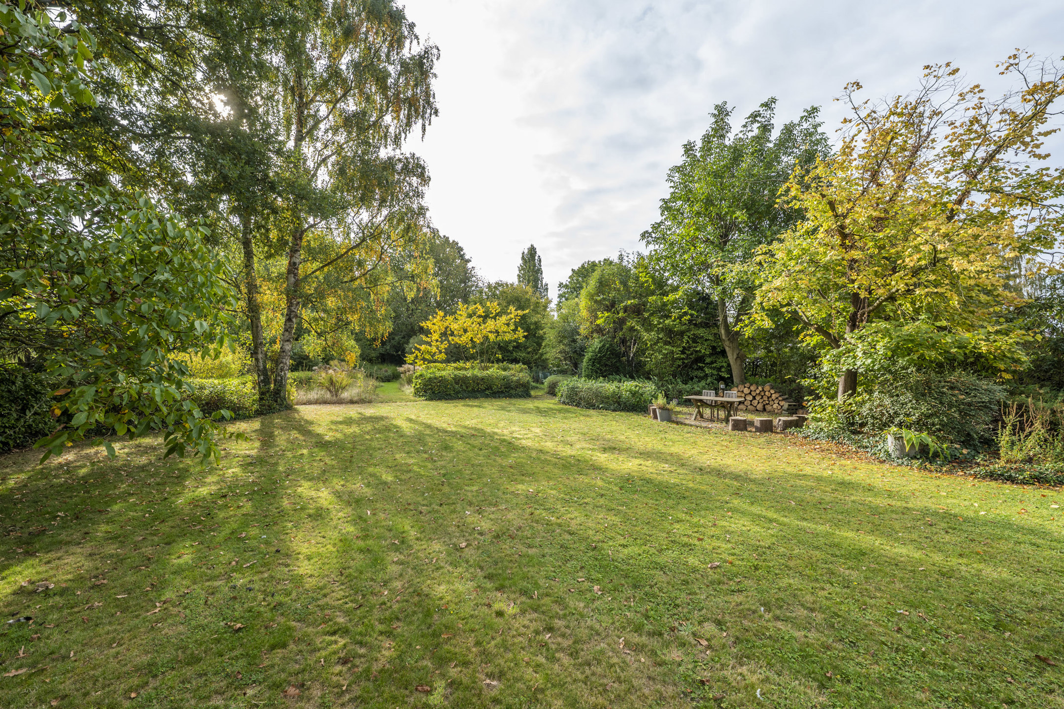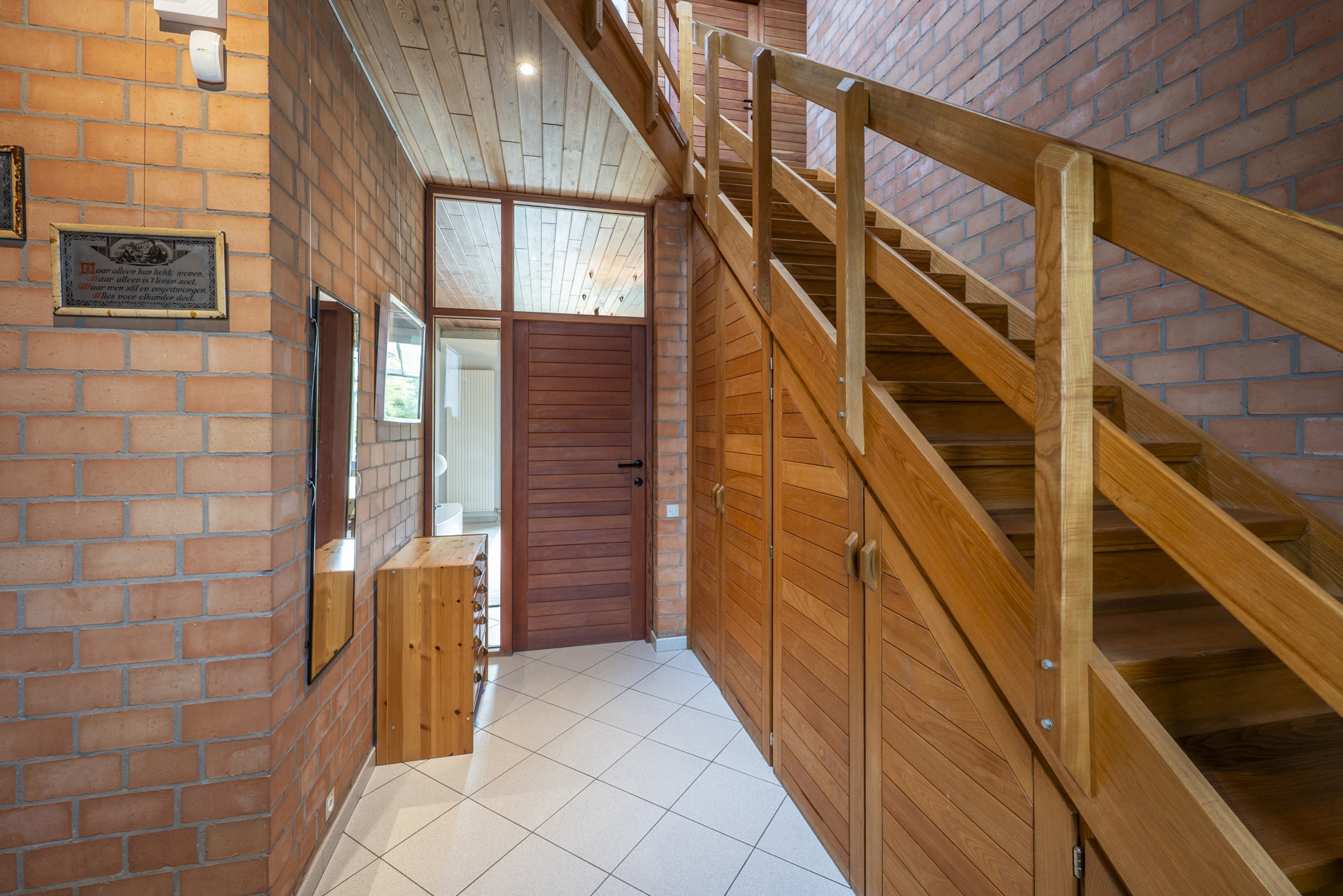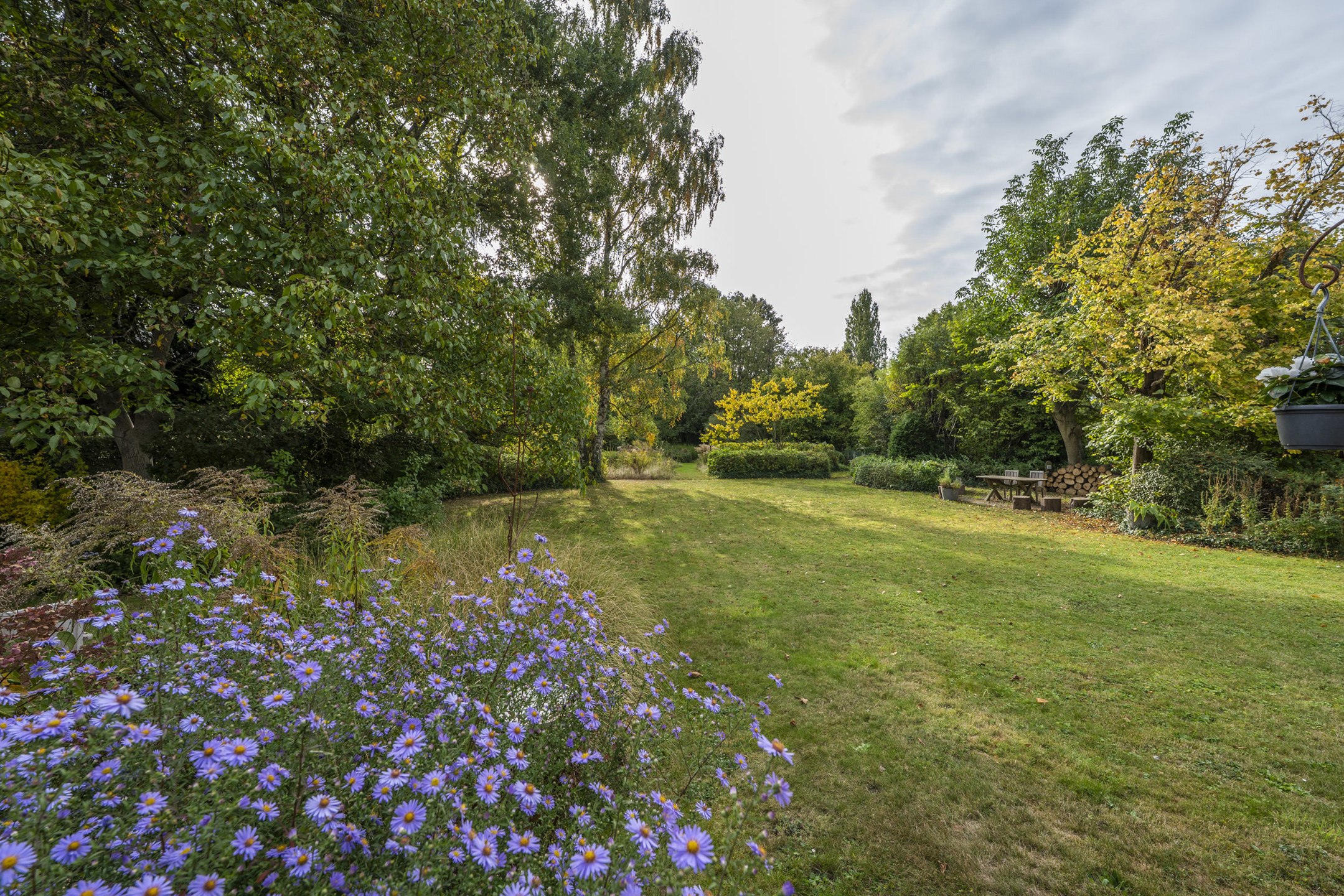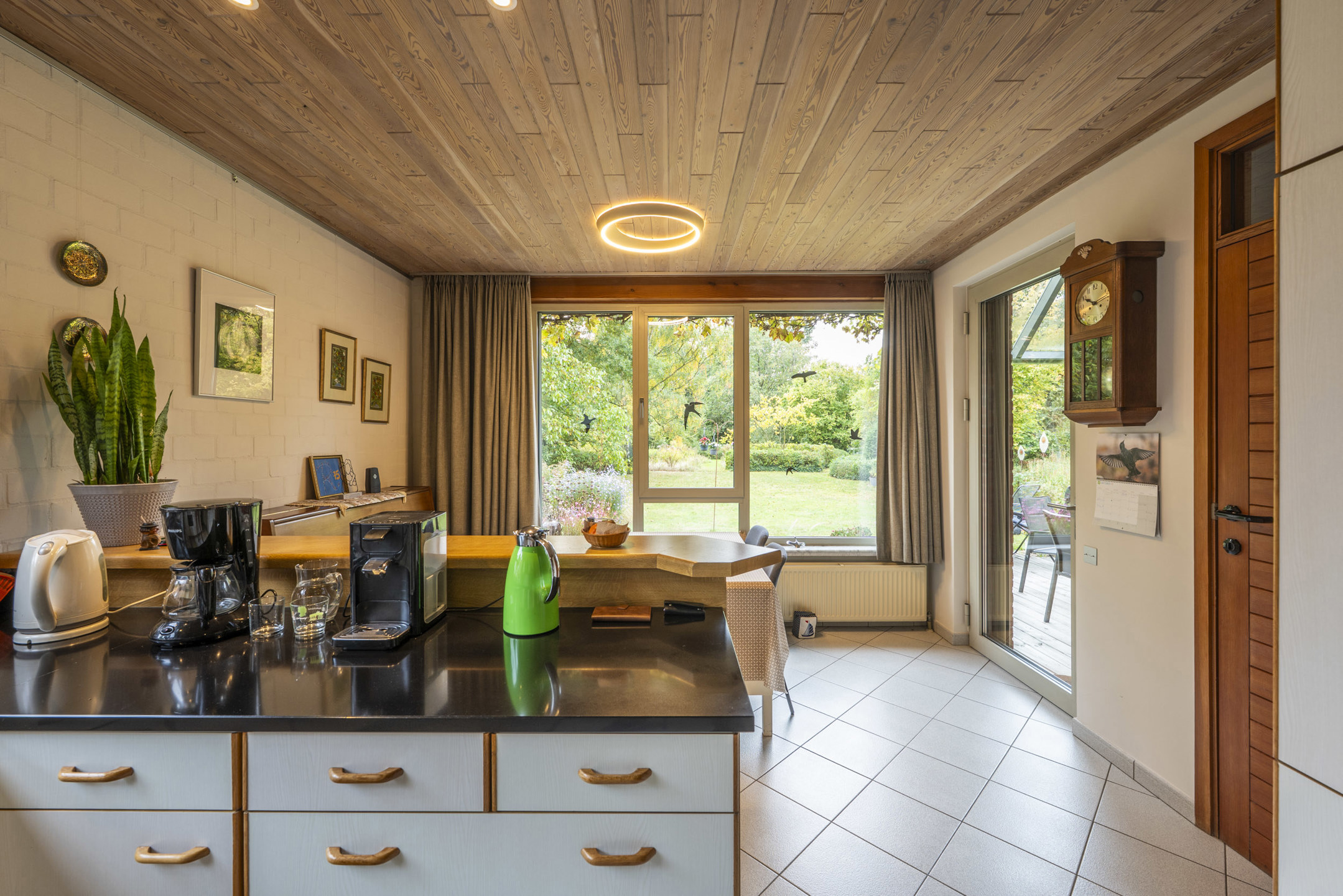 In een doodlopende straat tussen de velden ontdek je deze bijzondere postmodernistische parel gecreëerd door architect Etienne Hoeckx, die een uitzonderlijke aandacht schonk aan bio-ecologische materialen & bouwwijze voor een zo gezond mogelijke leefomgeving. Ook de tuin is doordacht aangelegd als oase van rust, natuurlijk en klimaatvriendelijk, met een variatie aan bloemen, struiken, gezellige zitplekjes en grote bomen, een speelparadijs voor kinderen en een schuilplaats voor vele diertjes.