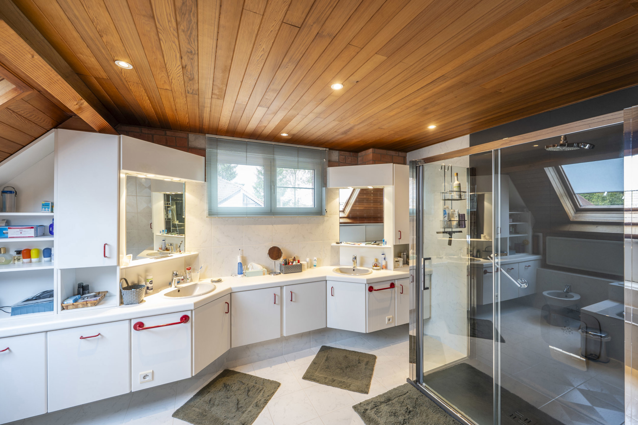 • Een grote badkamer met dubbele lavabo, recente inloopdouche en ligbad