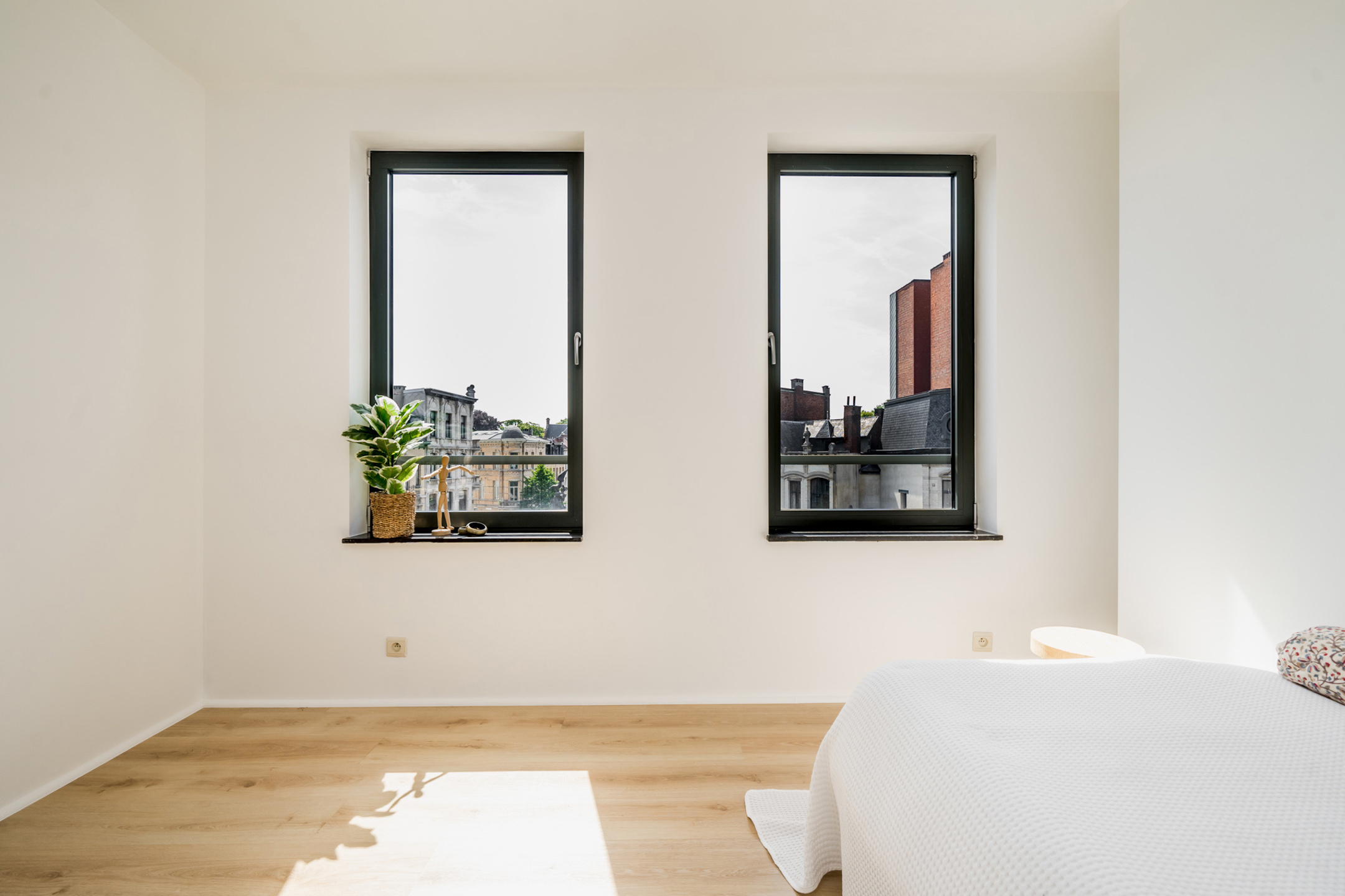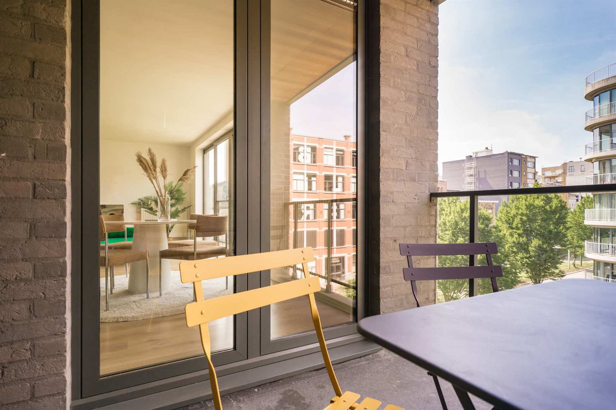 Het appartement ligt op de tweede verdieping van een modern gebouw uit 2006 en wordt betreden via een inkomhal met vestiaire. Als hoekappartement geniet het van mooi uitzicht op het Frederik de Merodeplein en de groene volkstuintjes.